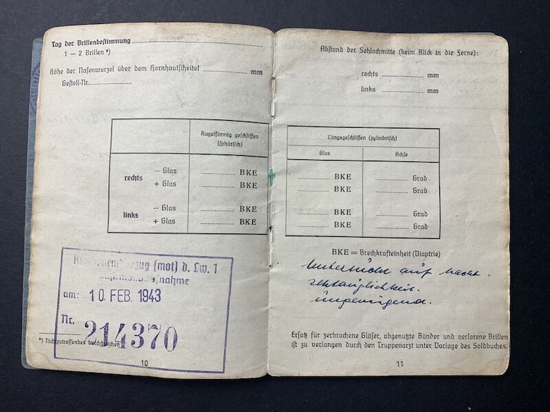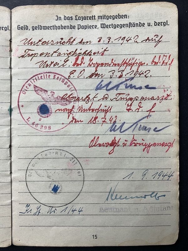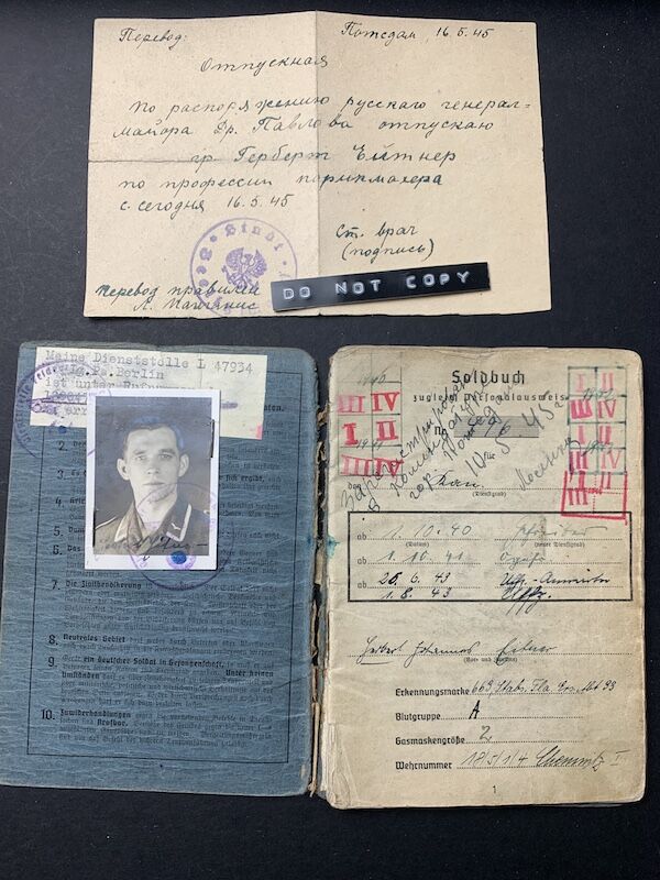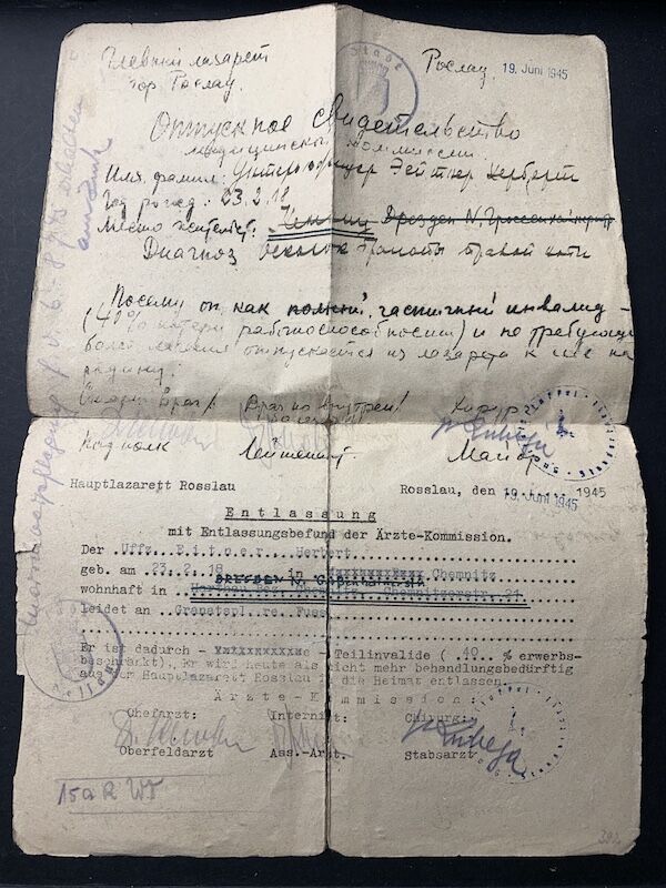 Soviet Documents in the back of the Soldbuch reveal that he was in the hospital in Potsdam and was seen by Generalmajor Dr Pawlow, who decided to release Eitner from the hospital, by June 1945 he was declared 40% disabled due to the injury.