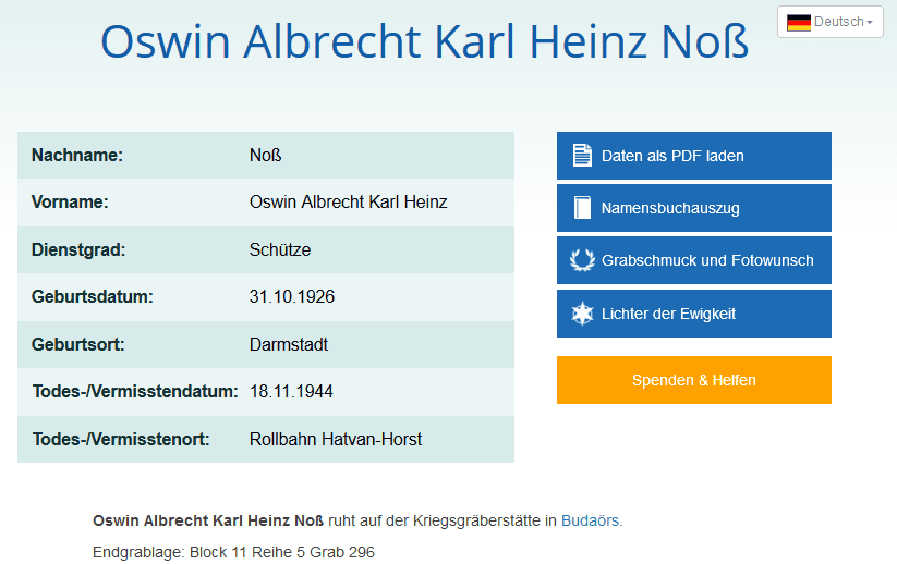 Oswin Noss is mentioned in the German Volksbund Website, he has a grave in Hungary.