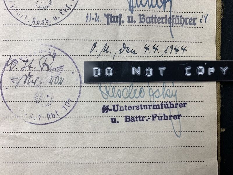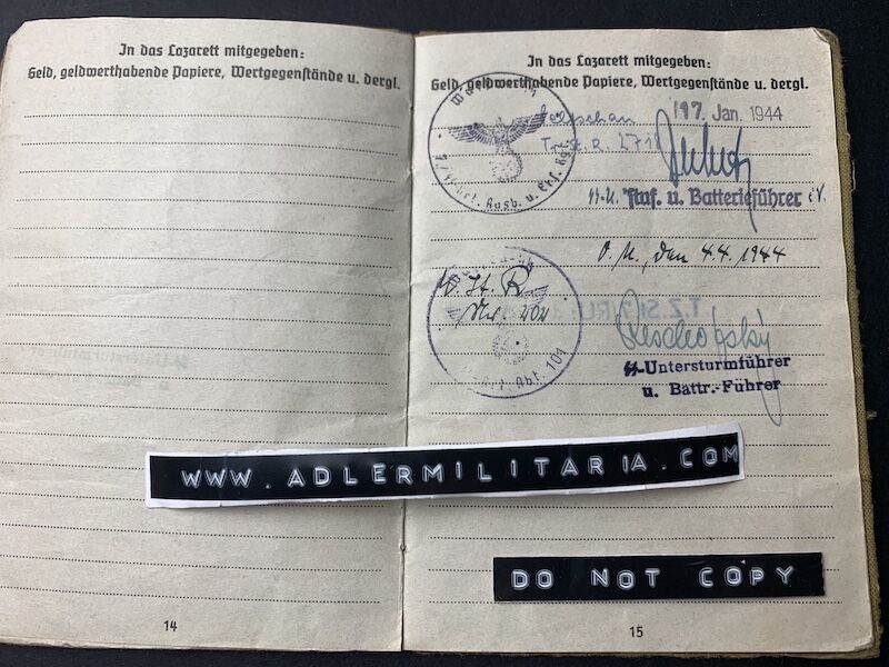 GrĂ¼ndel was issued his full SS Uniform on the 19th of January 1944, he would join his unit frontline unit in March 1944 (according to a security stamp on page 15).
