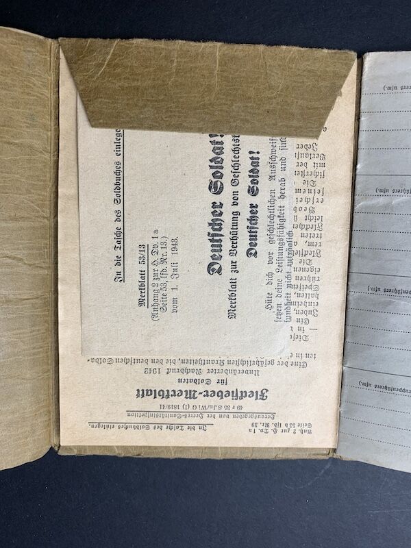 In the rear of the Soldbuch is two Merkblätter: 1 for Sexually Transmitted Diseases as warning to German Soldiers. 2 For the dangers of Typhus.
