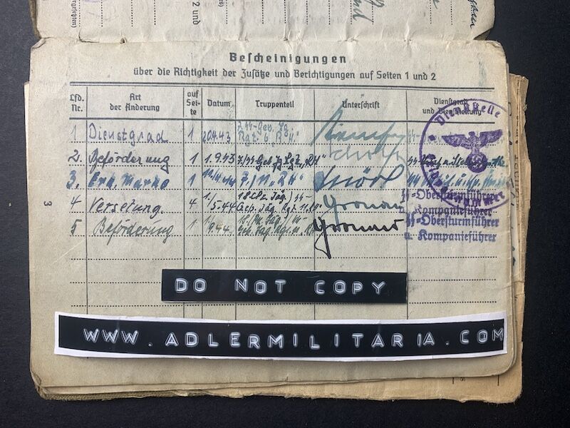 September 1944 – SS Rottenführer (Promotion certificate included) hand signature SS-Standartenführer Berthold Maack – Maack has an extensive history, one of the men who took part in the killings in 1934 during the Night of the Long Knifes. He later served in the concentration camp Dachau, his last postings was as commander of the Hungarian and Estonian Waffen SS Divisions.