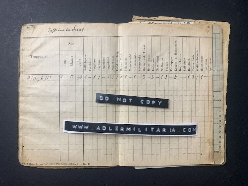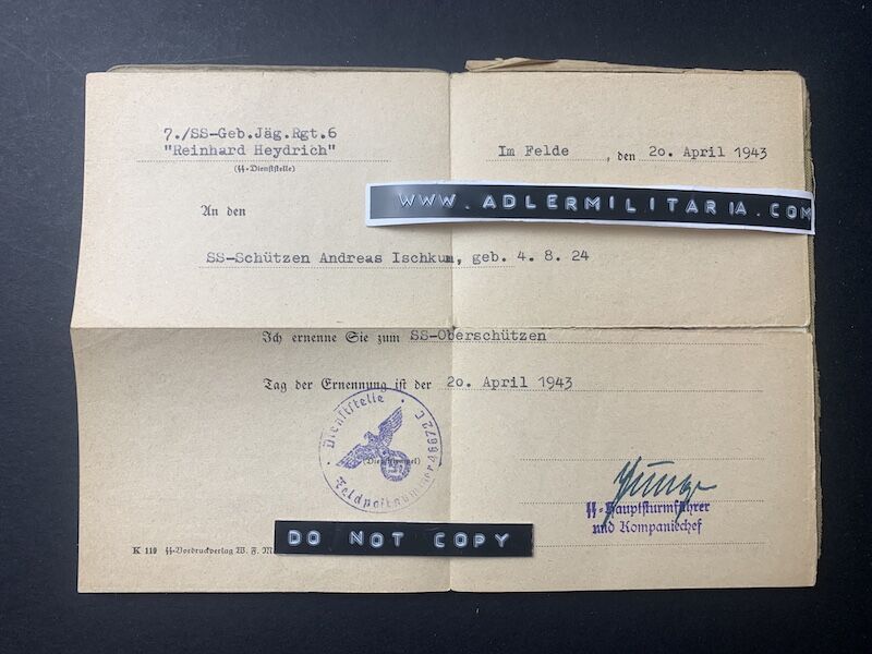 April 1943 – SS Oberschützen (Promotion certificate included) hand signed by the Company Commander.