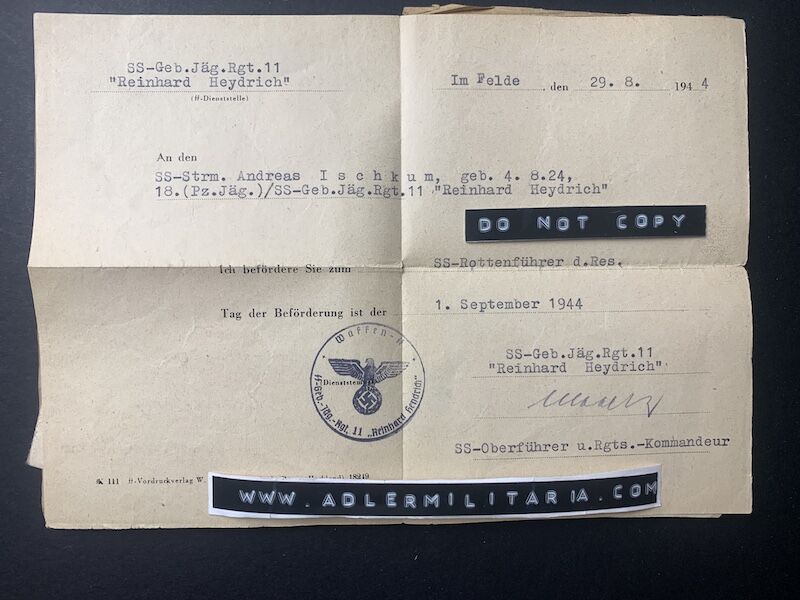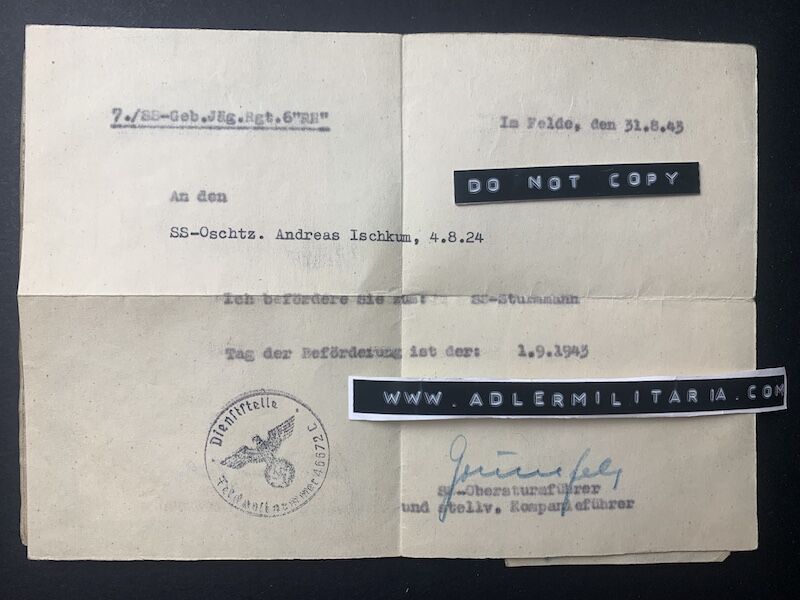 September 1943 – SS Sturmmann (Promotion certificate included) hand signed by the Company Commander.