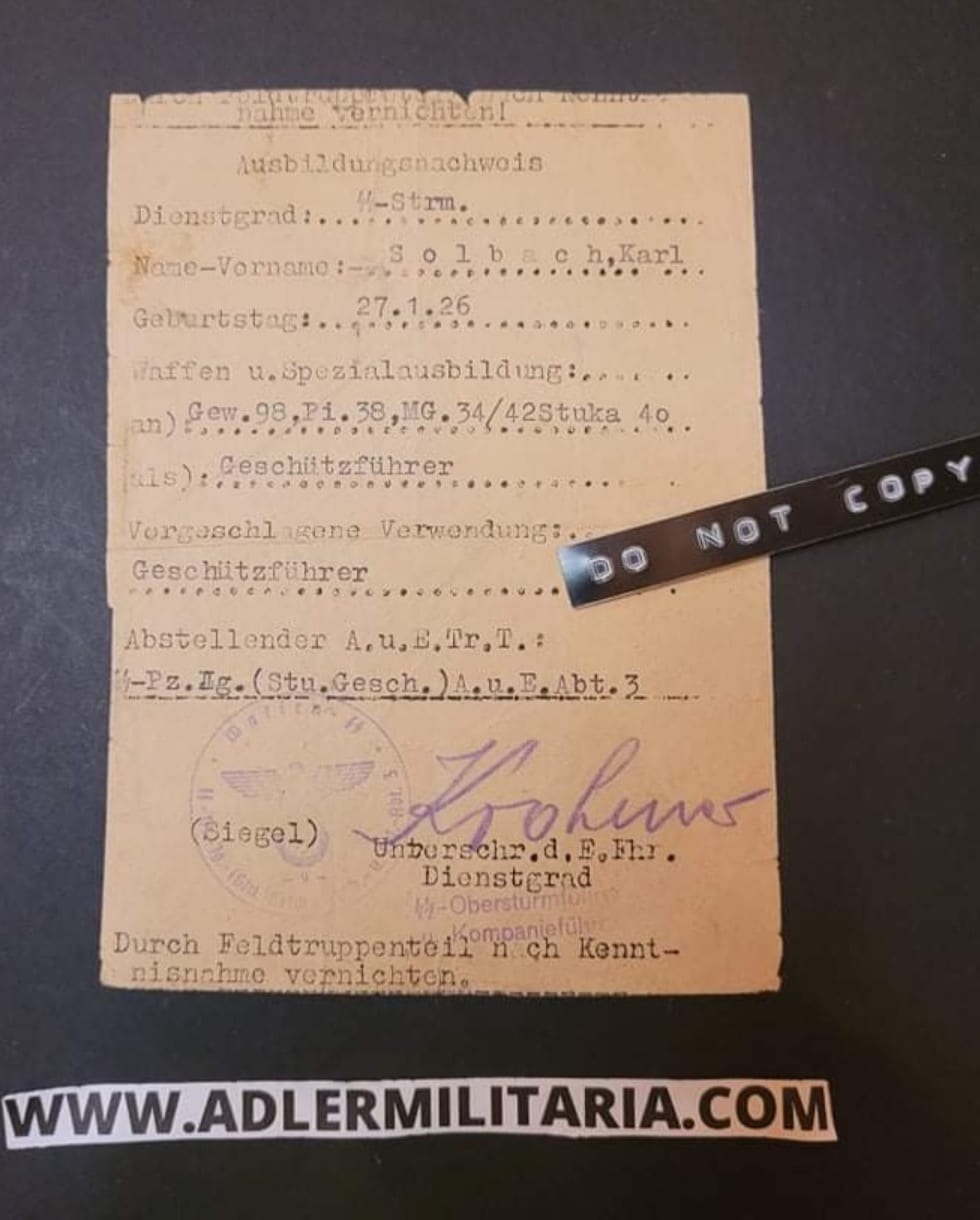 Stating: Trained on : K98, MP38, MG 34 and Stuka 40 (Wurfrahmen 40). He was to be used as a StuG Commander according to this document.
