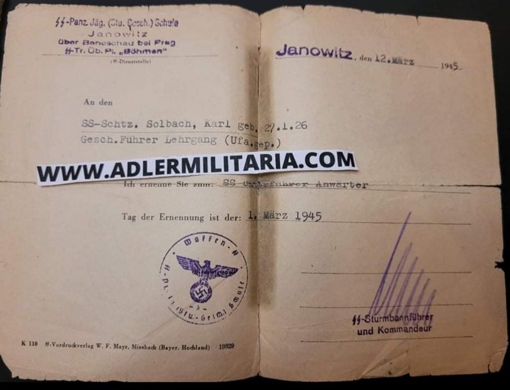 This training unit was armed with StuG Tank Hunters, and Soldbach Promoted to SS Sturmmann and Unterführer March 1945.