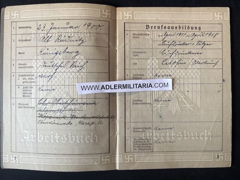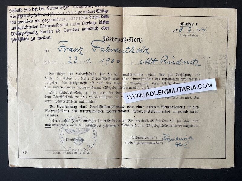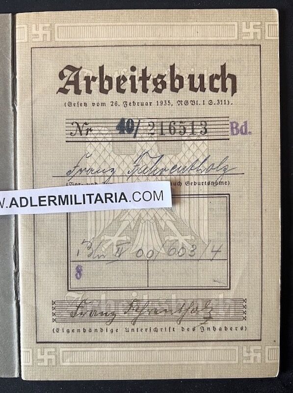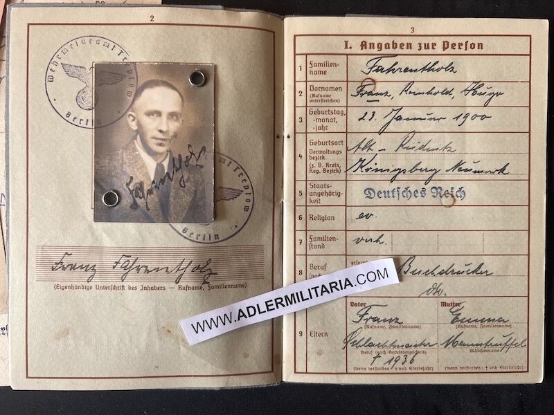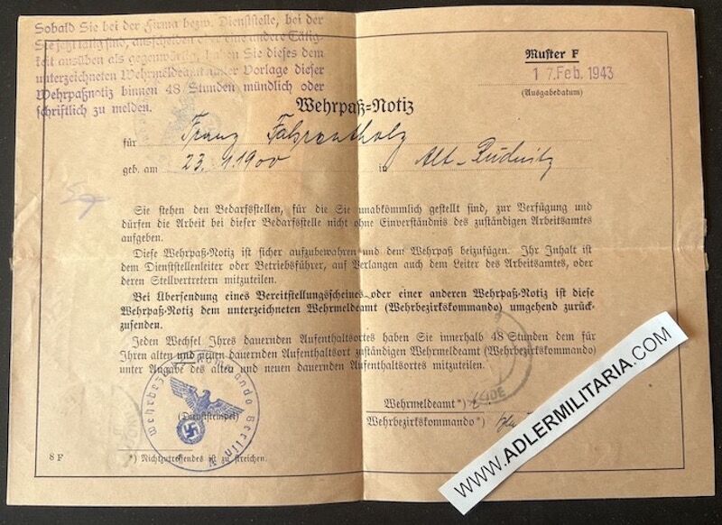 Franz was given the rank of Flakwehrmann, which was a civilian rank given to those that completed a standard course designed in 1943. The objective of which was to train civilians on anti-aircraft related equipment for the purpose of defending the home front. On successful completion of the course the rank of Flakwehrmann was reached and the soldier was awarded a civilian badge. The badge was worn on the left side of the lapel, the eagle of the Luftwaffe holding the swastika inside the cog symbol the symbol for German workers.