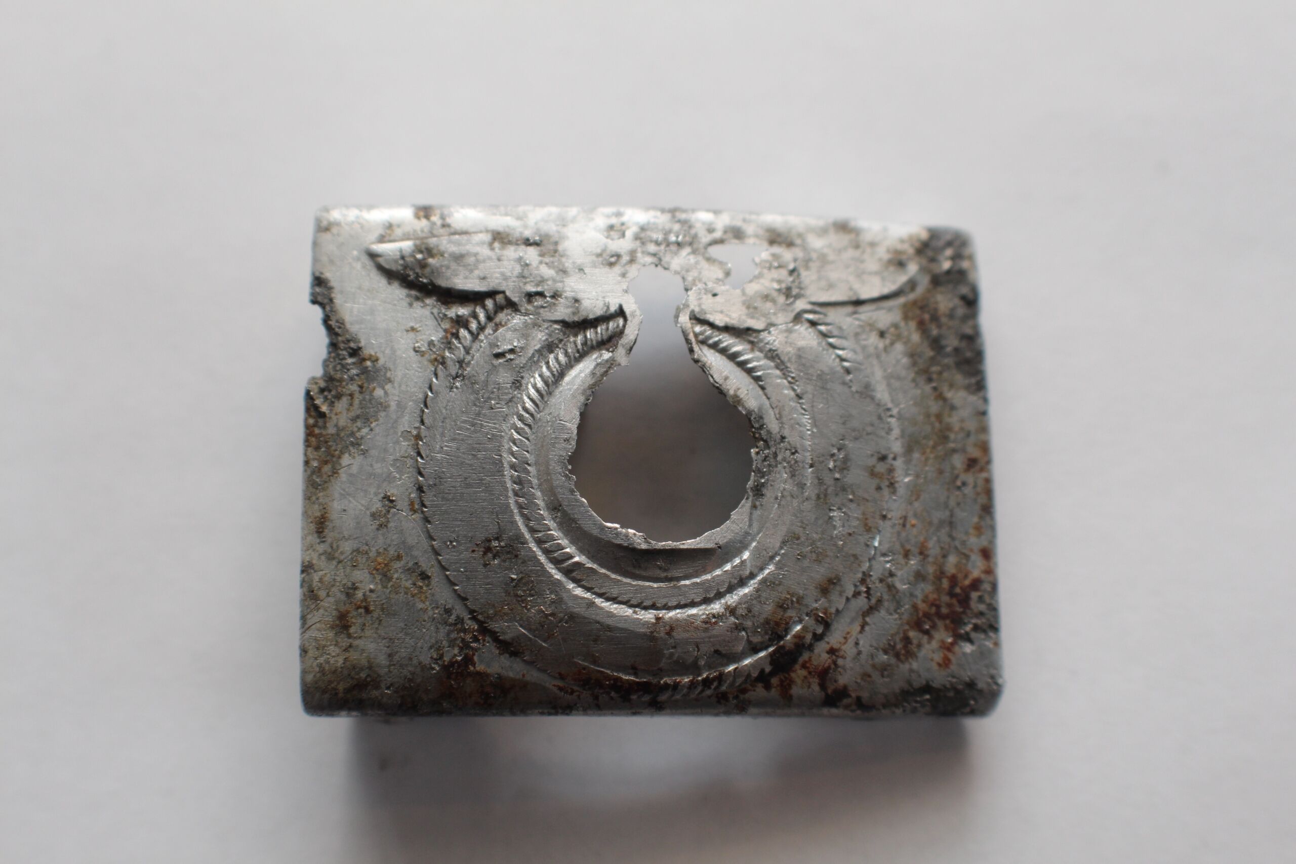 Two A very nice piece of history here, a de-nazified Waffen SS Belt Buckle! Partisans or Red Army men did not have such a belt buckle and they often took or used the enemies belts! This is a nice example and was found in Kurland (Latvia in 2015).