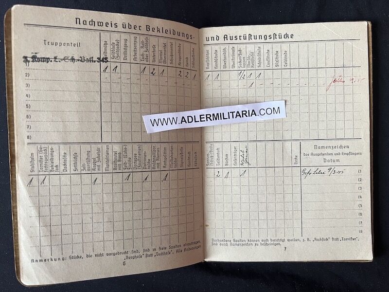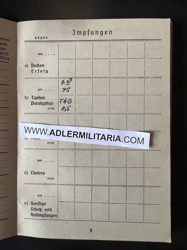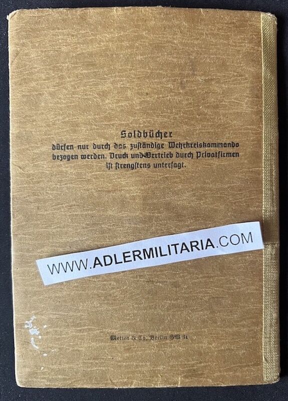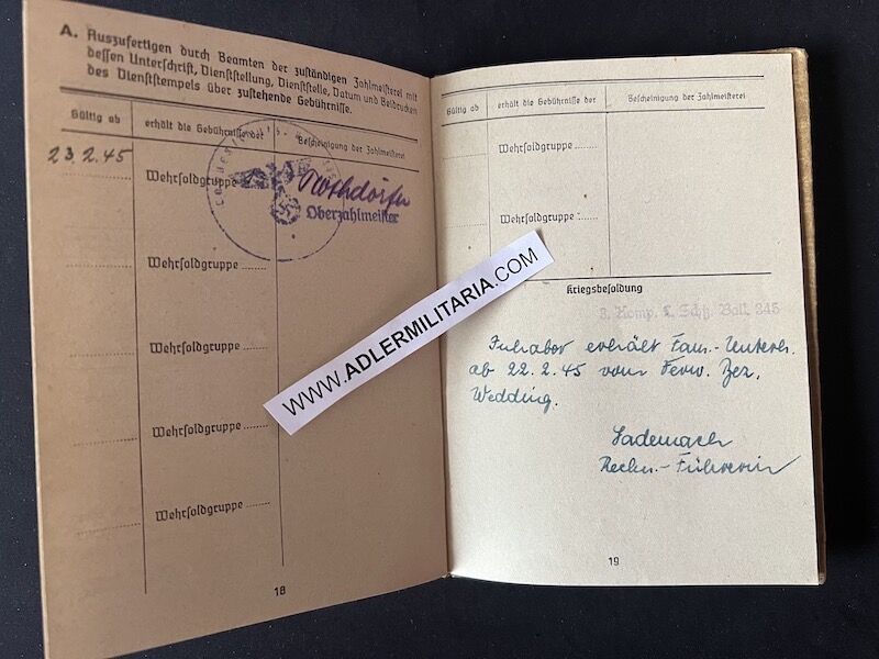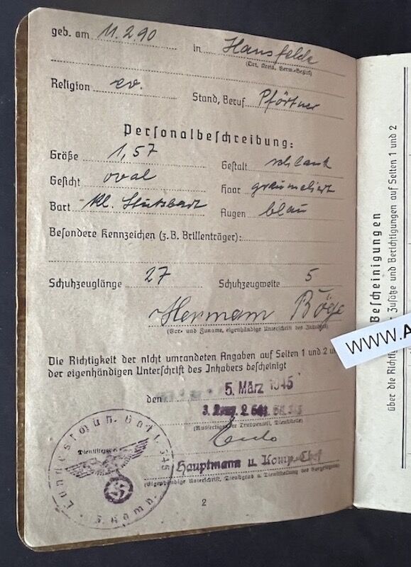 Soldbuch to Unterfeldwebel Hermann Böge. This World War I veteran, 157 cm short and already 55 years old, was called up for the Endkampf in March 1945, retaining his WWI rank. He was a Berlin resident and remained in his city to serve with Landesschützen-Bataillon 345, at that time located in Berlin-Lichterfelde. Though originally not intended for front line fighting, this Landesschützen unit was trapped in the city and did see fierce action during the last weeks of the war, fighting off the 1st Ukrainian Front.