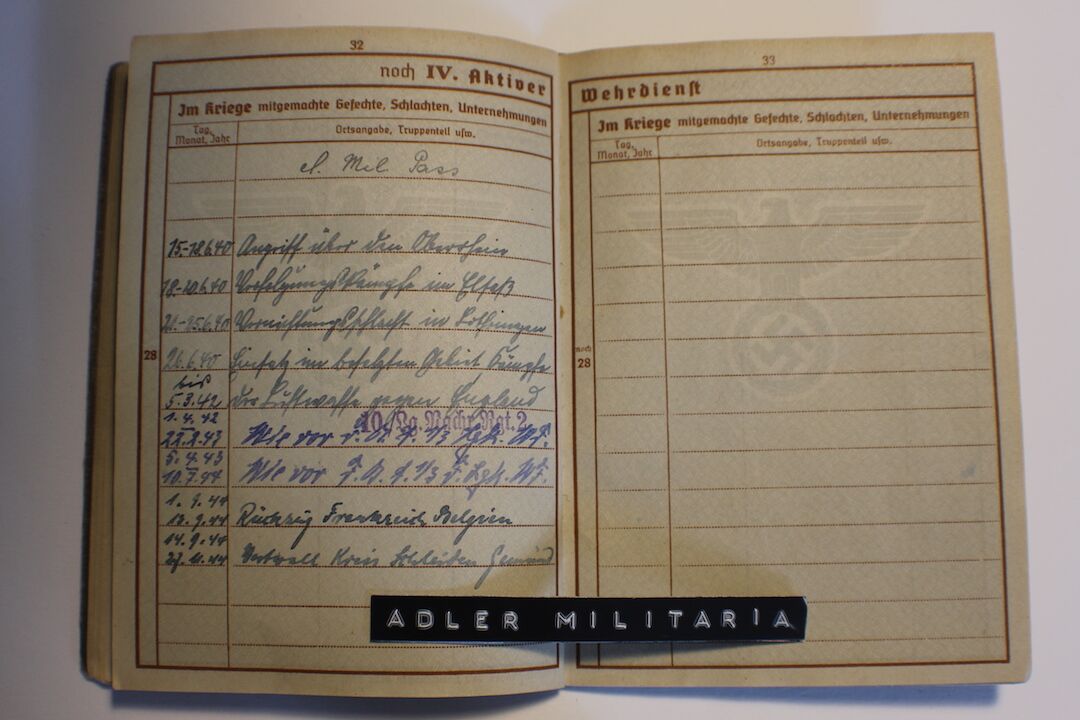 He would serve in the battle against France in 1940, and in Elsaß, and would assist the Luftwaffe in the fight against England. He would later take part in the ‘’ruckzug’ retreat from Fance and Belgium in 1944.