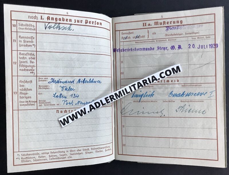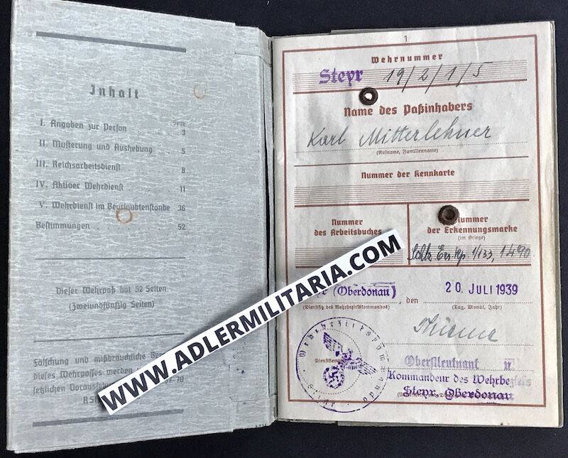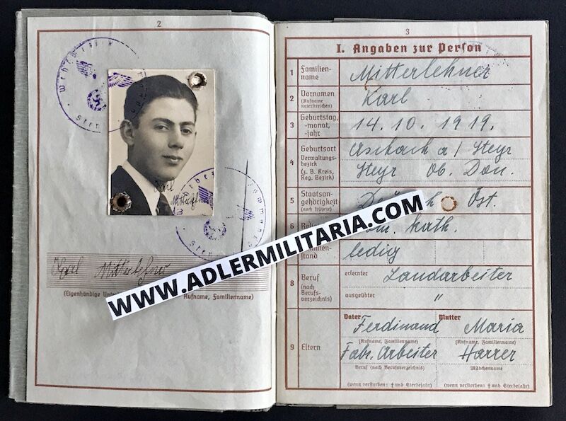 Wehrpass – Schützen Mitterlehner – Iron Cross Posthumus – KIA – IR133 (45ID) Battle of Brest Fortress! (Hold)