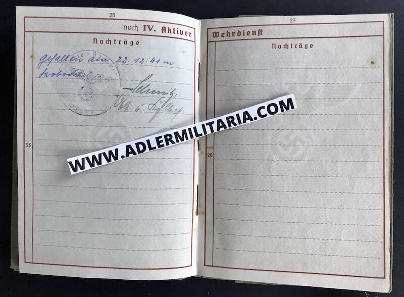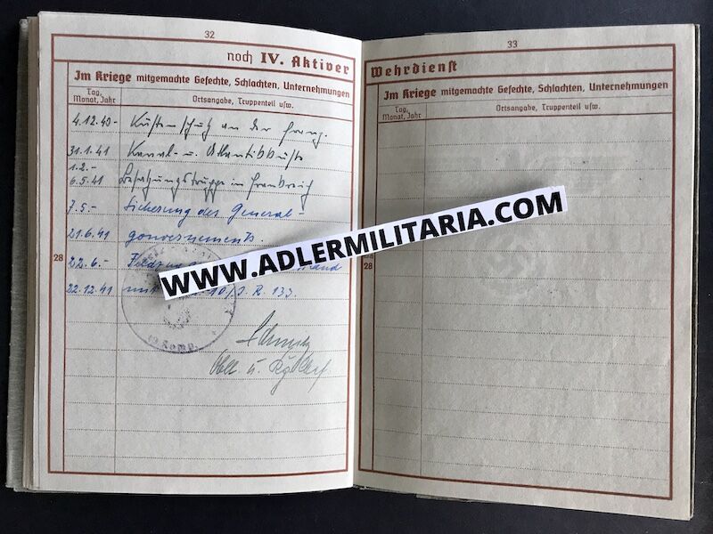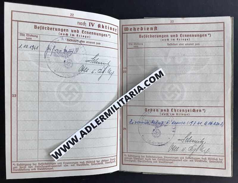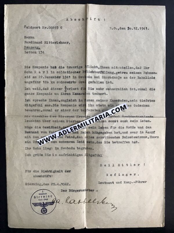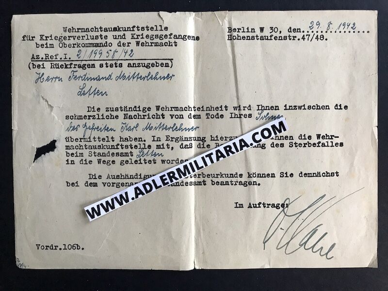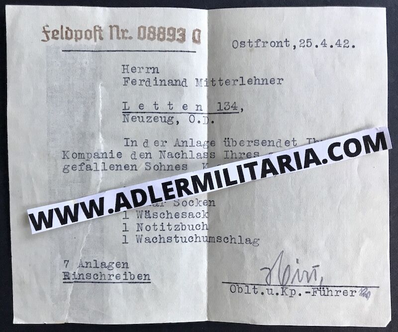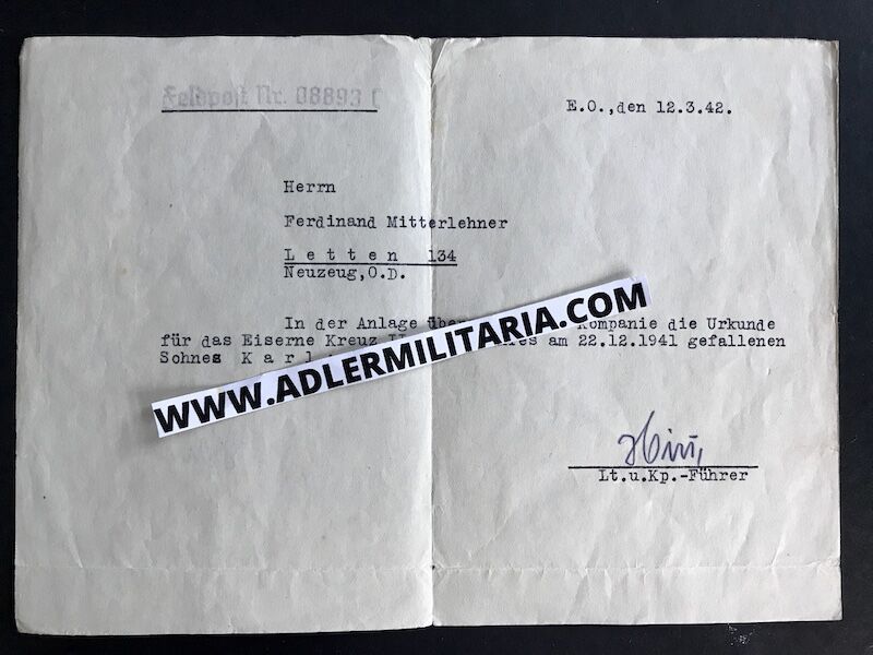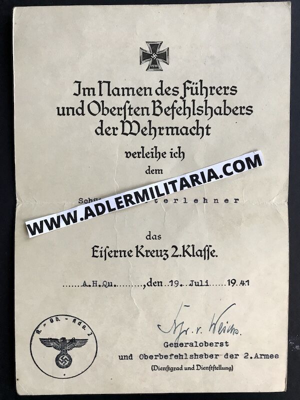 The Iron Cross Certificate sent to his father, was signed by General Maximilian von Weichs (Knights Cross with Oak Leaves).