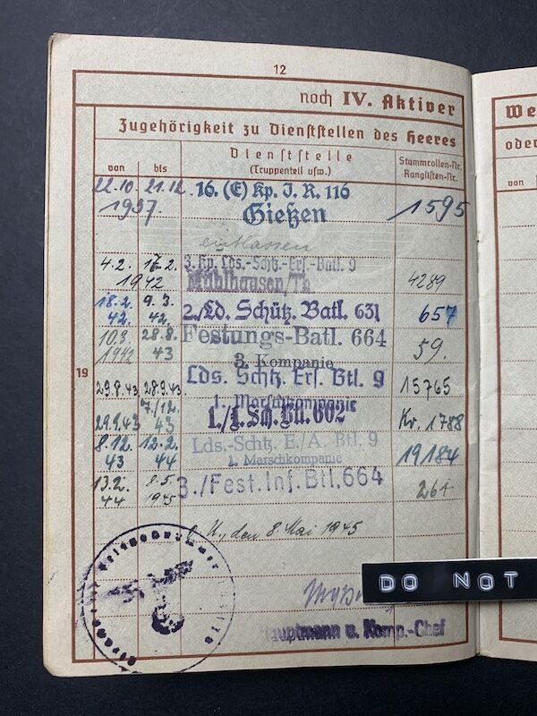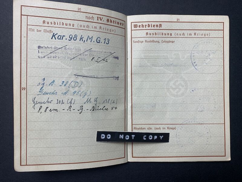 He was trained on the following weapons: Panzerschreck (38), Rifle M.95 (j), Rifle 302 (f), MG 138 (l), 8,8mm Panzerscheck (54)