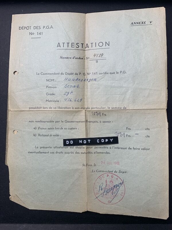 Hundeshagen surrendered on the 8th of May 1945 in Norway, and it seems he was sent to France to a POW Camp (come swith French POW release papers).