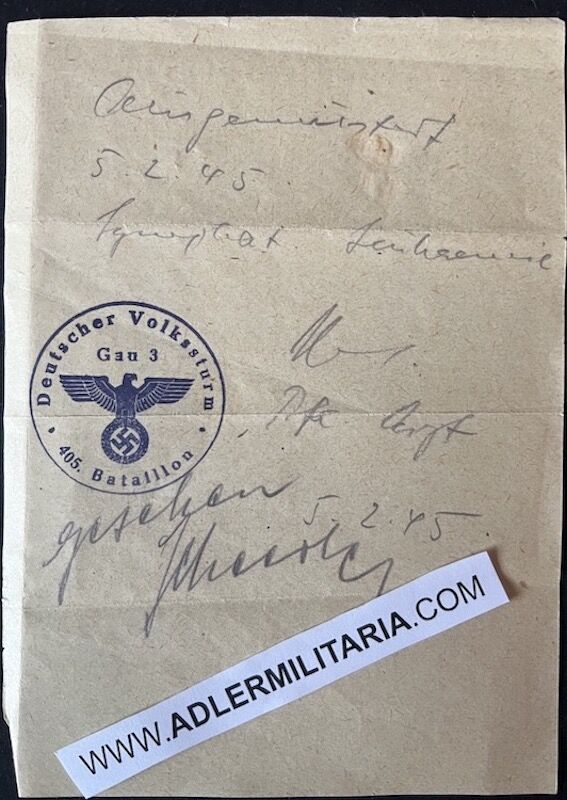 The Volkssturm – the German Homeguard – was established in October 1944 as a militia utilizing males between the ages of 16 and 60 who were not otherwise serving in the Wehrmacht or other military units. They were under the control of the Nazi party and its officials (Gauleiters) with Heinrich Himmler as commander.