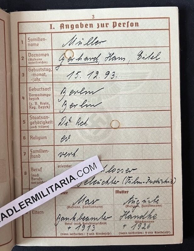 Gerhard Müller, born in Berlin on the 15th of December 1893, worked in his civilan career as a Light Operator on Film Industry in Berlin. He lived with his wife in Schöneberg. He served in the First World War and earned the Iron Cross First Class for bravery. He was enlisted in the Berlin Volkssturm in November 1944.