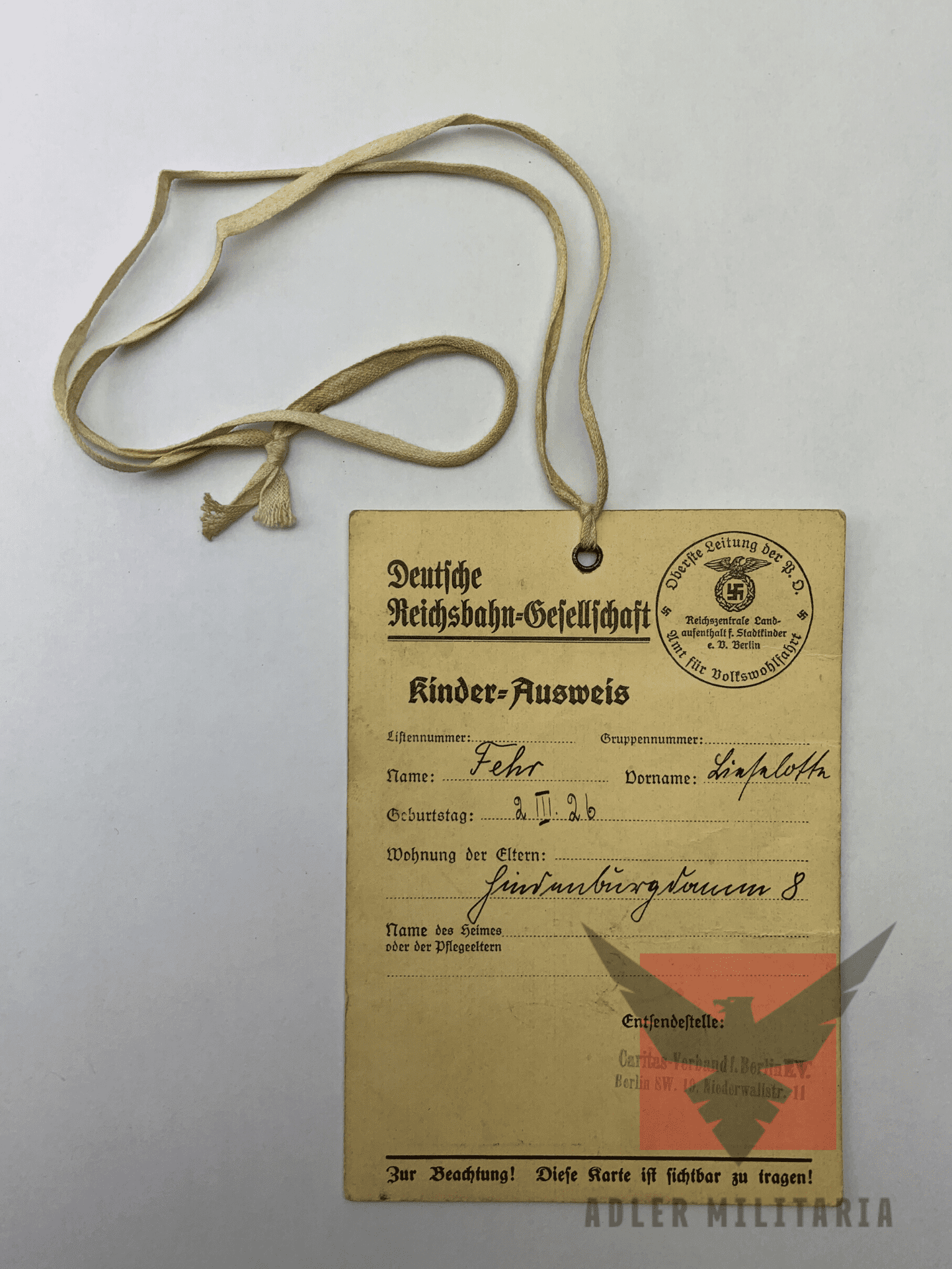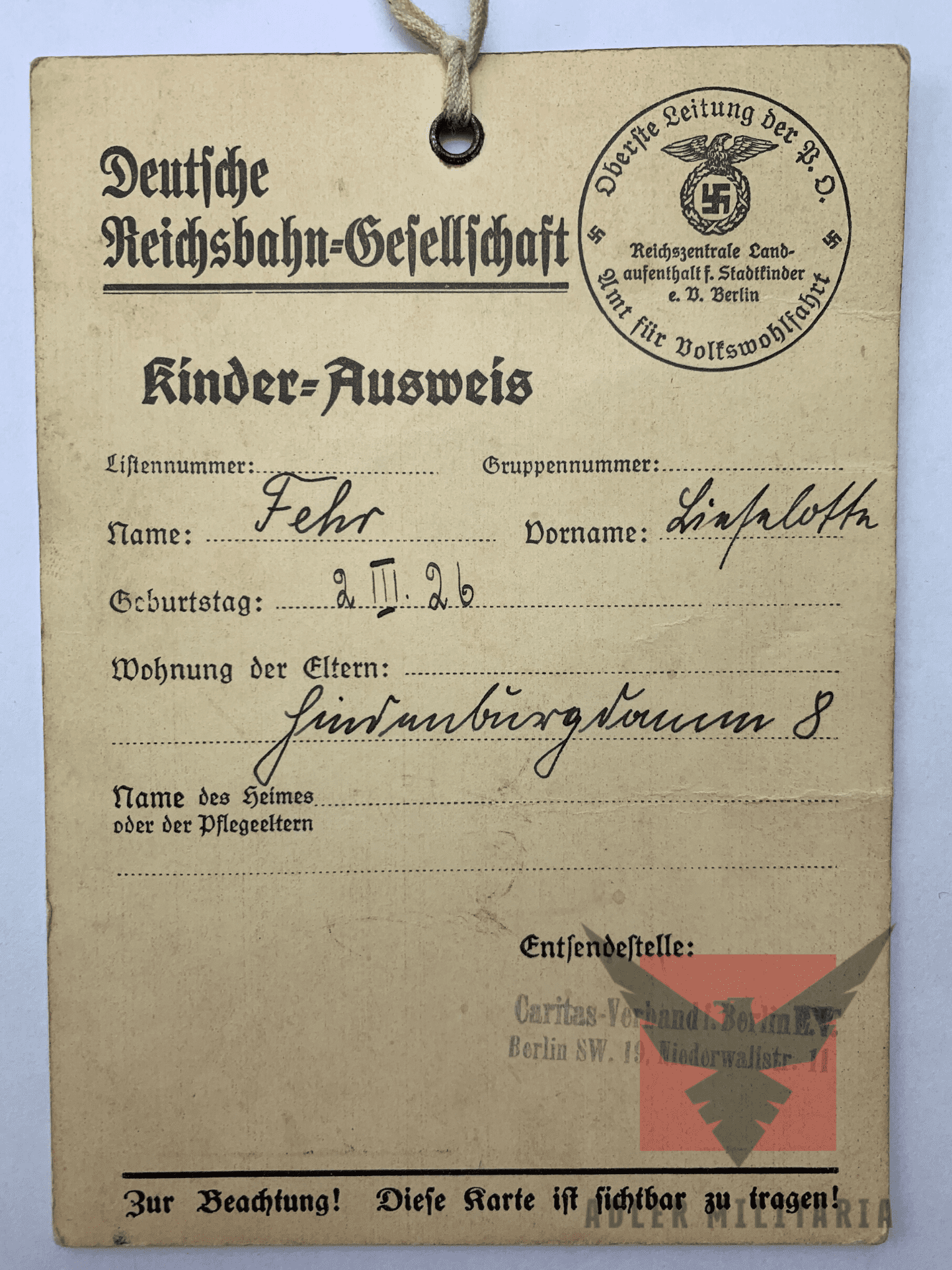 WW2 German ID for Child – ‘Out of the City’