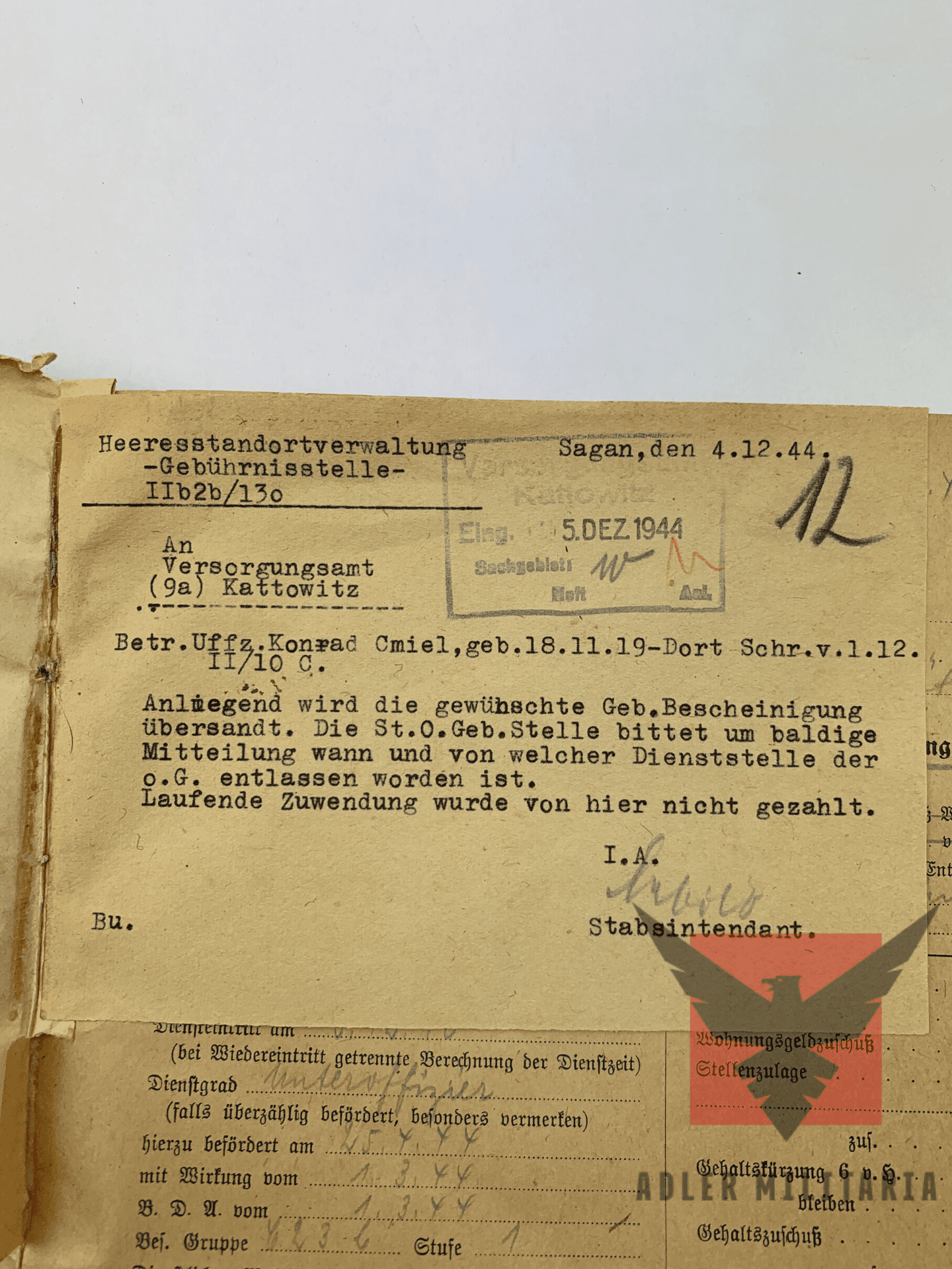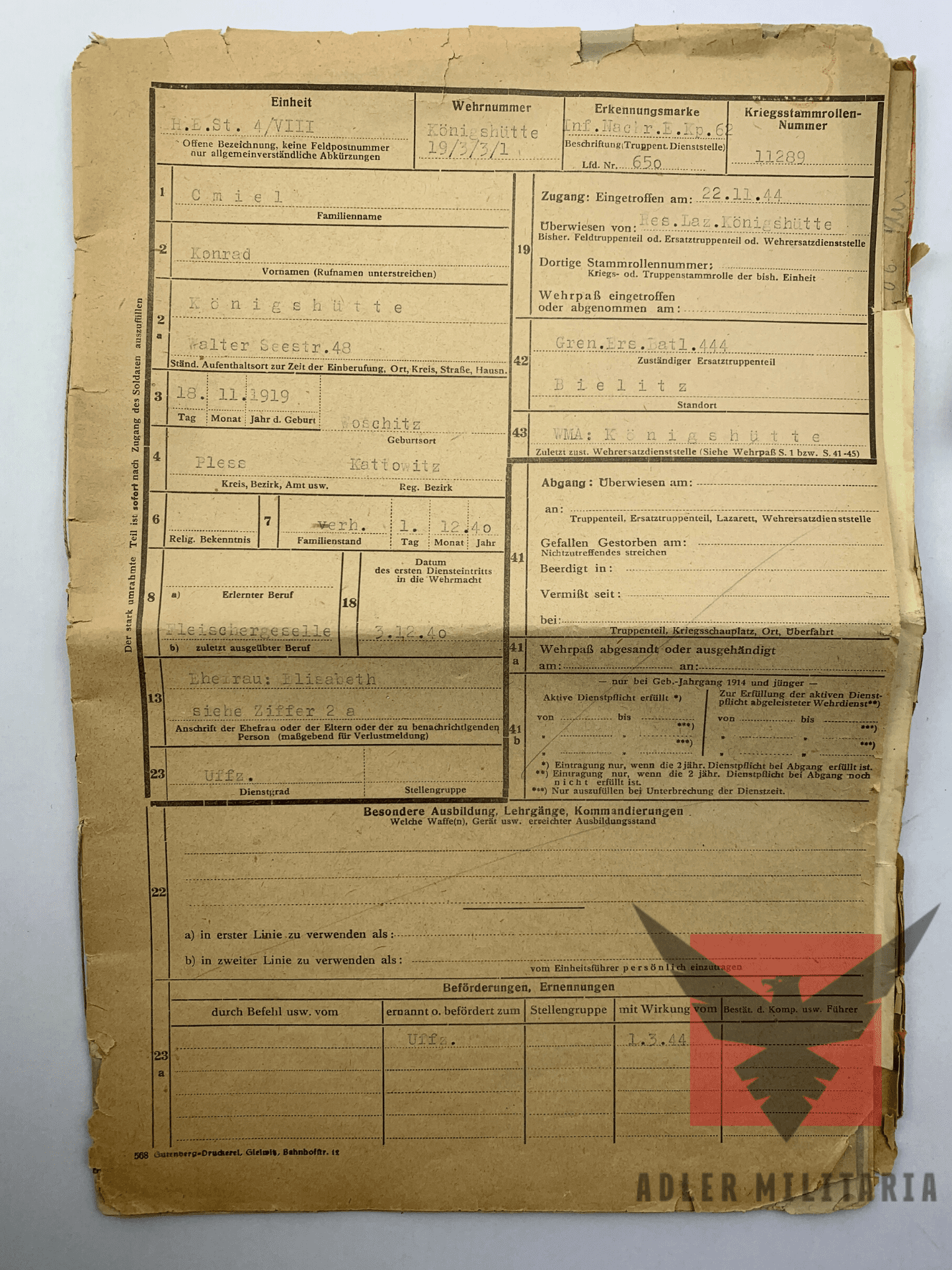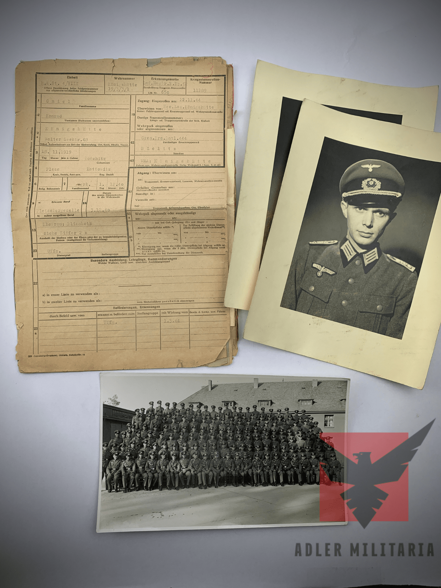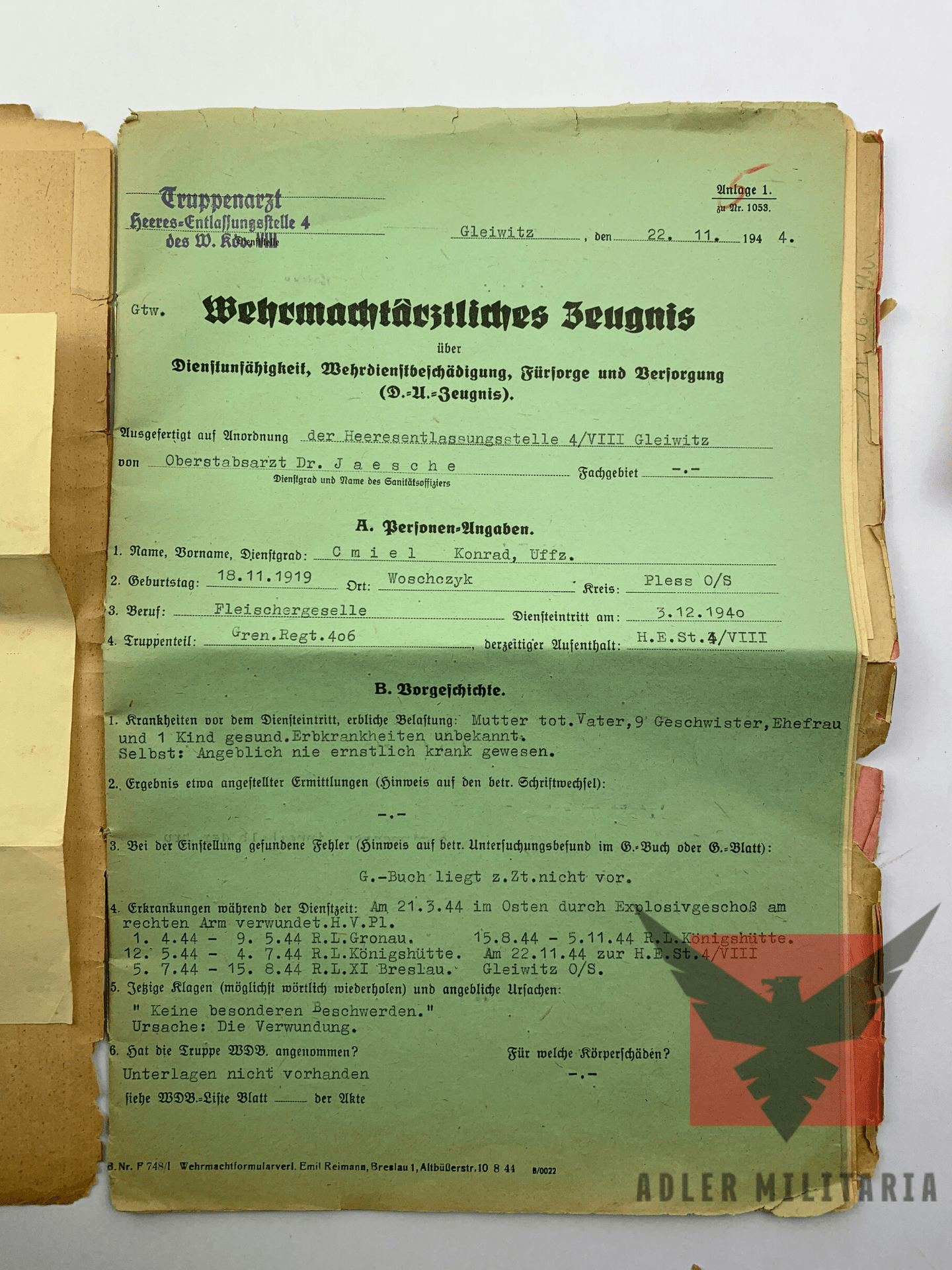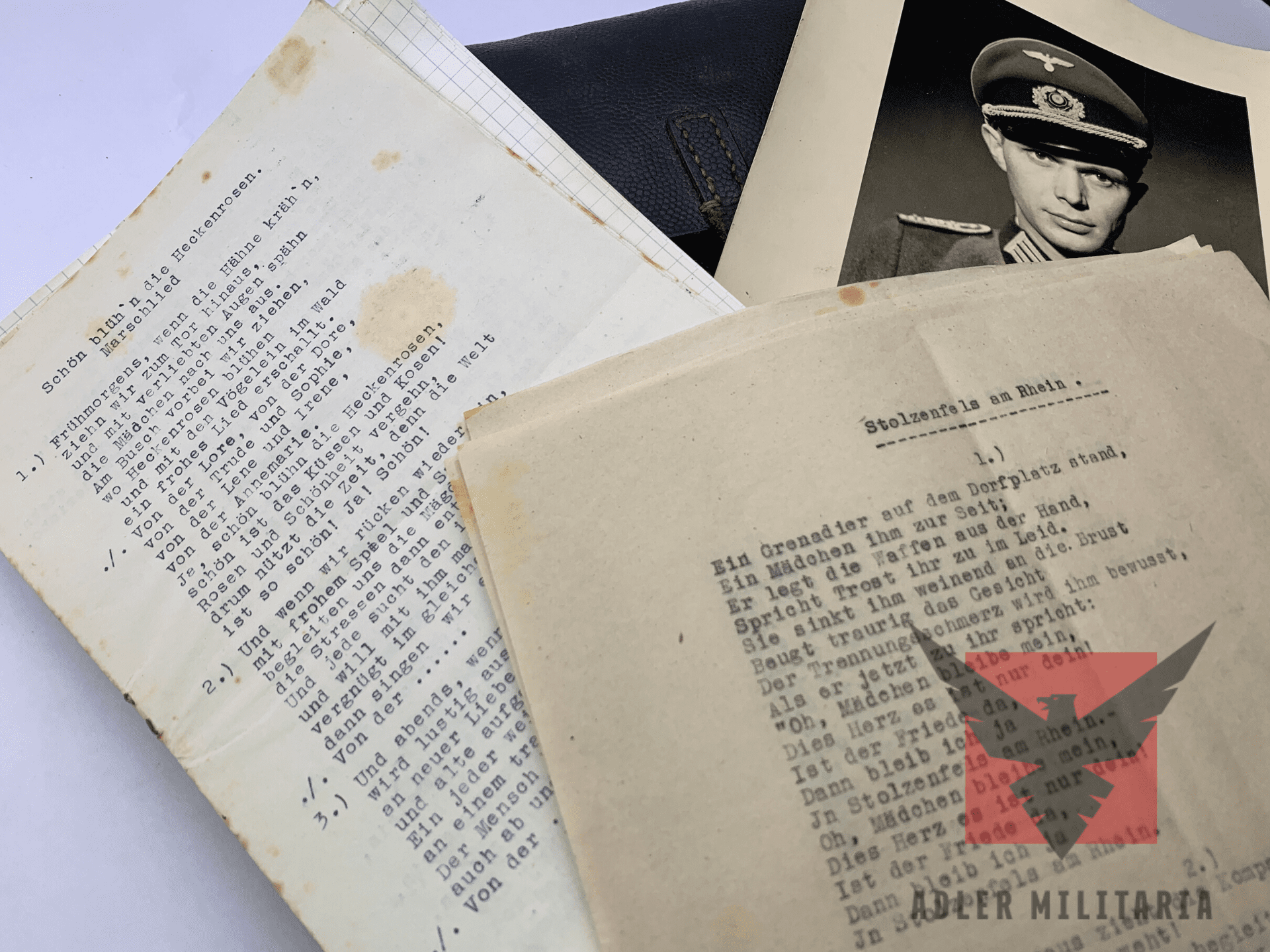 Contents: Uffz Cmiel suffered a serious wounding in Southern Russia an explosive round destroyed his right hand. It was so bad that he lost his lower arm. The contents go into depth on his war injury. Various Documents are official Wehrmacht documents and correspondence about his wounding and later discharge. A total of 15 Pages, all are official statements and assessments made by the Wehrmacht. Includes are two different hand typed German Army marching songs.