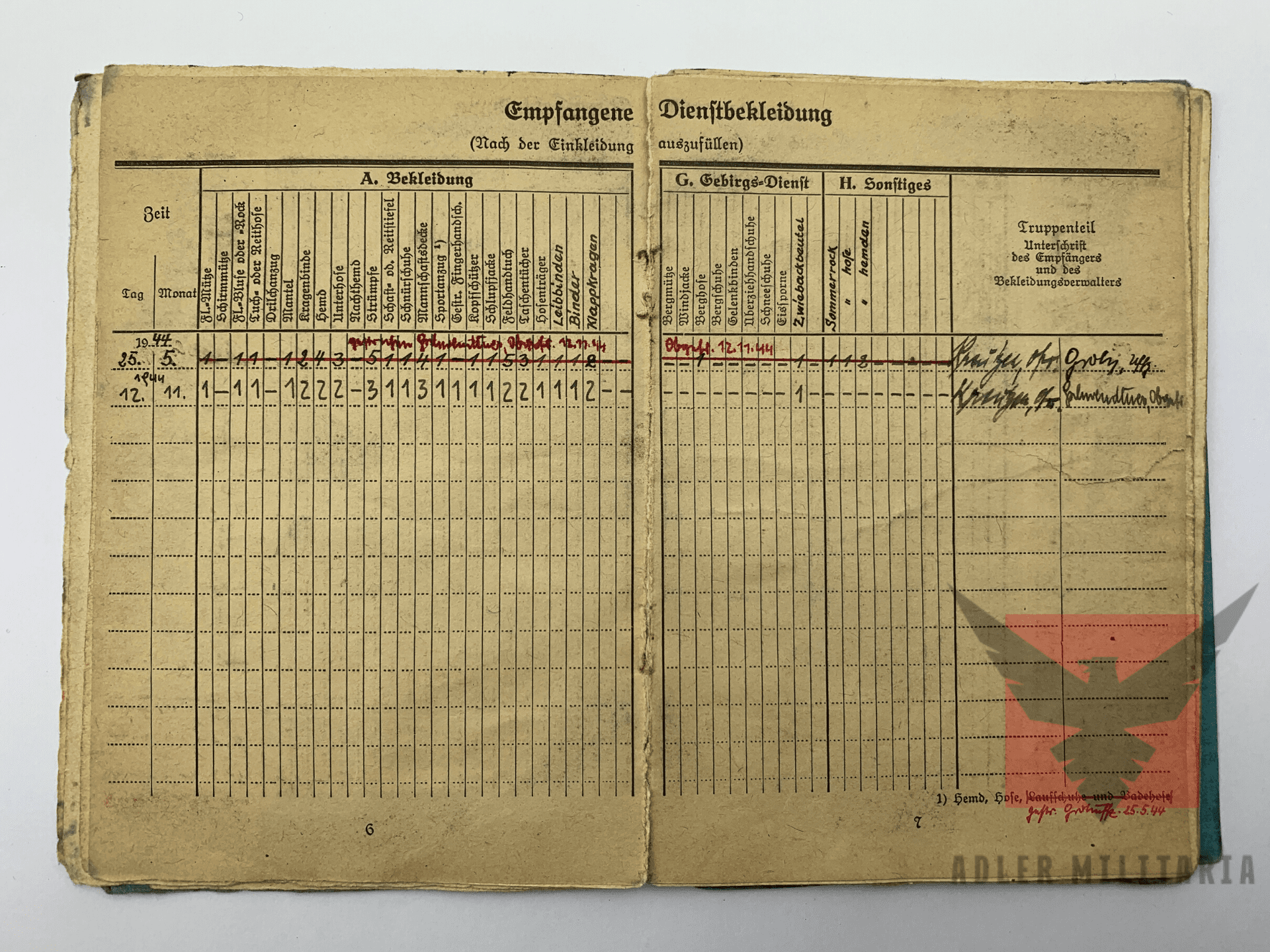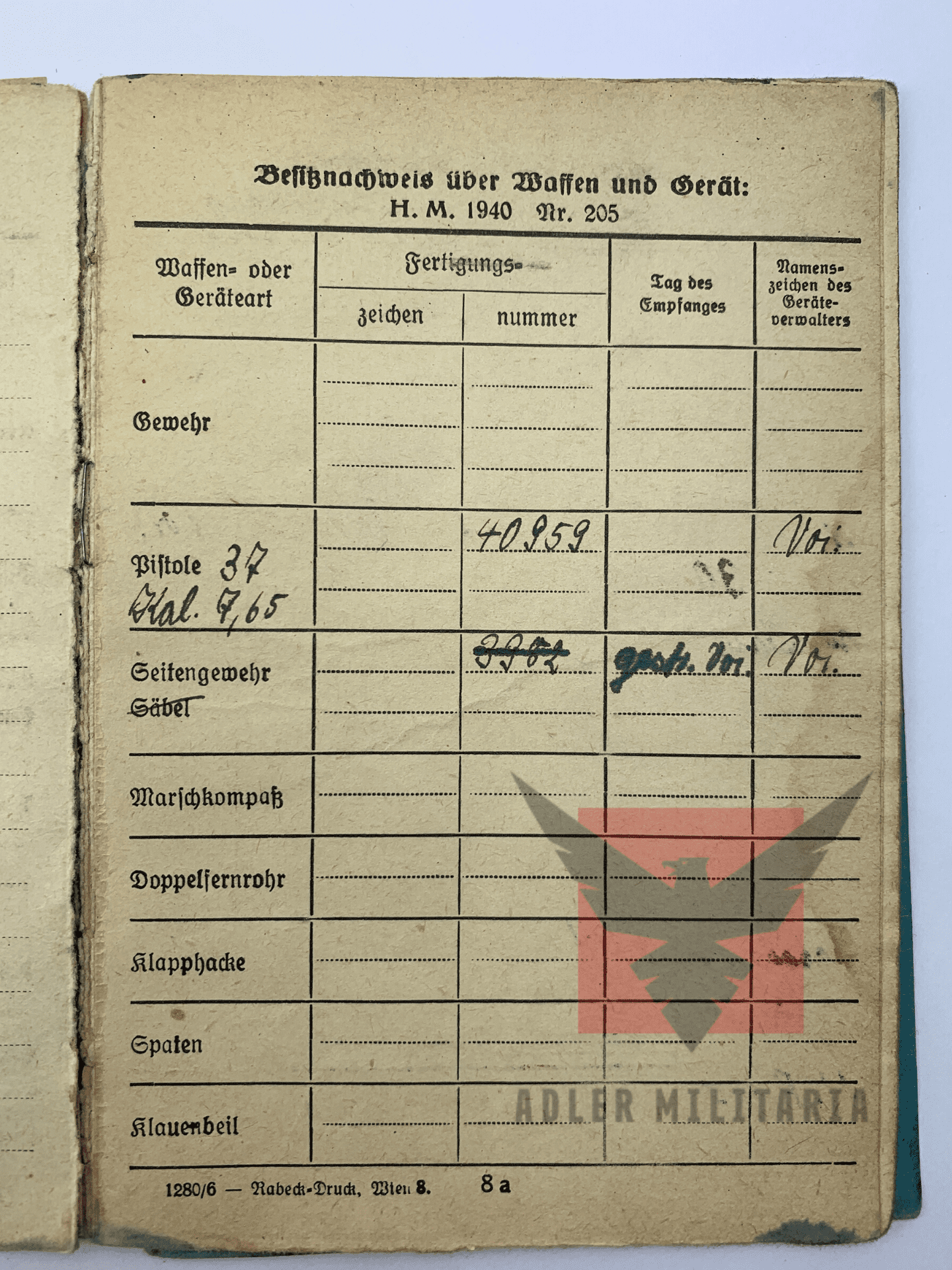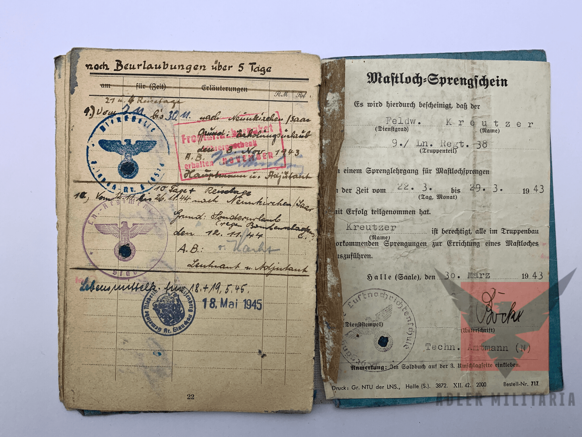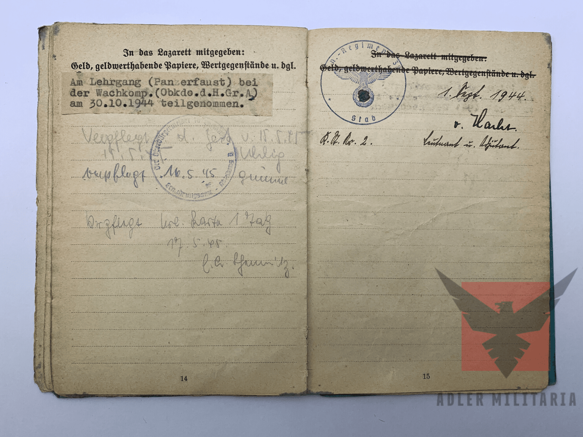 Weapons: Issued a Pistol Model 37, 7.65mm. MP40 Sub Machine Gun. On the 30th of November 1944 he was taught how to operate a Panzerfaust by the Wachkomp of Oberkommando des Heeres Gruppe A. Extra Paper: Mastloch Sprengschein, this is a permit for the blowing of holes for large antennas (Issued March 1943).