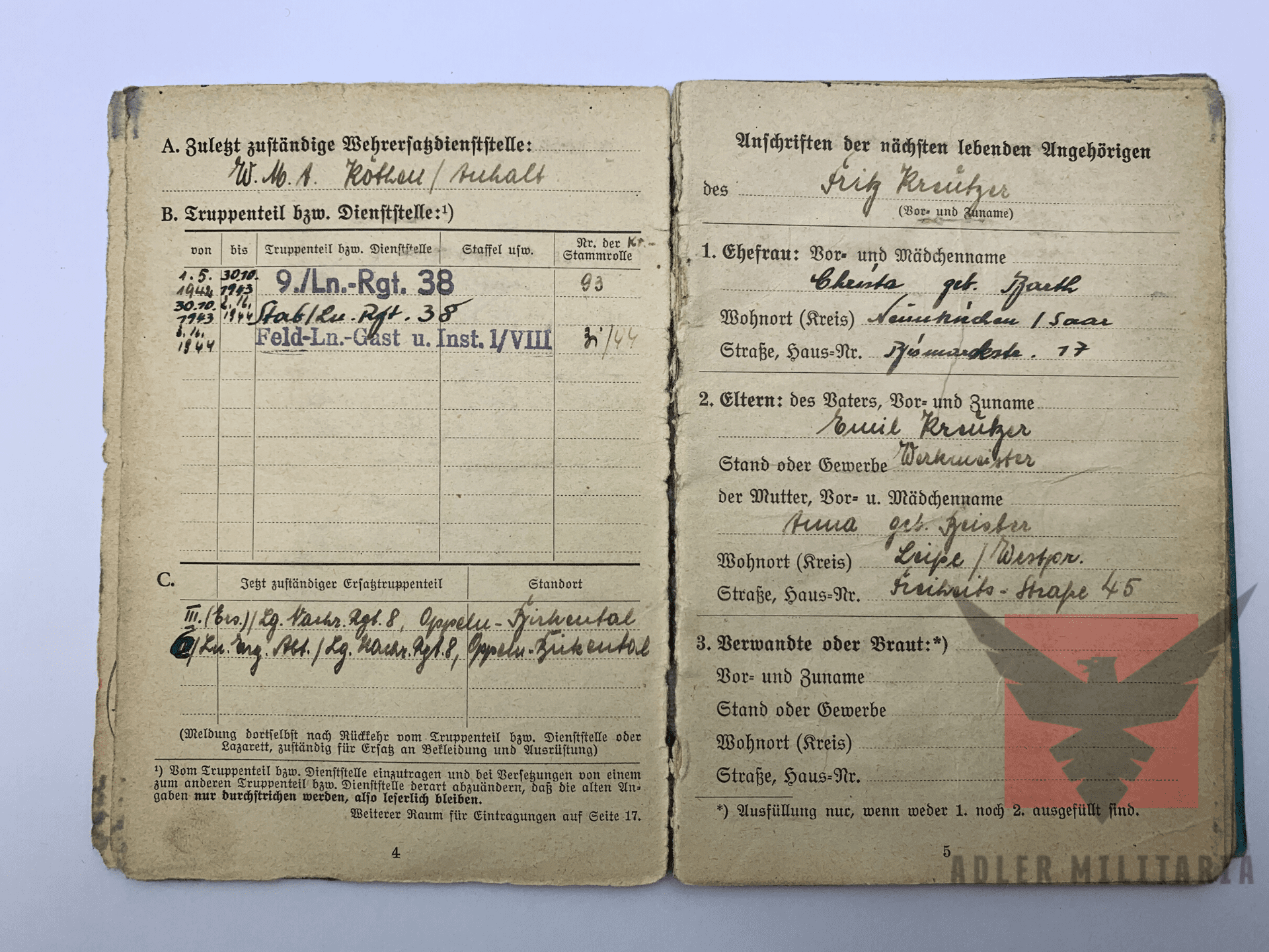 Kreutzer served from 1.5.1942 – 2.12.1944 with Luftnachrichten Regiment 38, ending the war out with the rest of Luftwaffenkommando VIII.