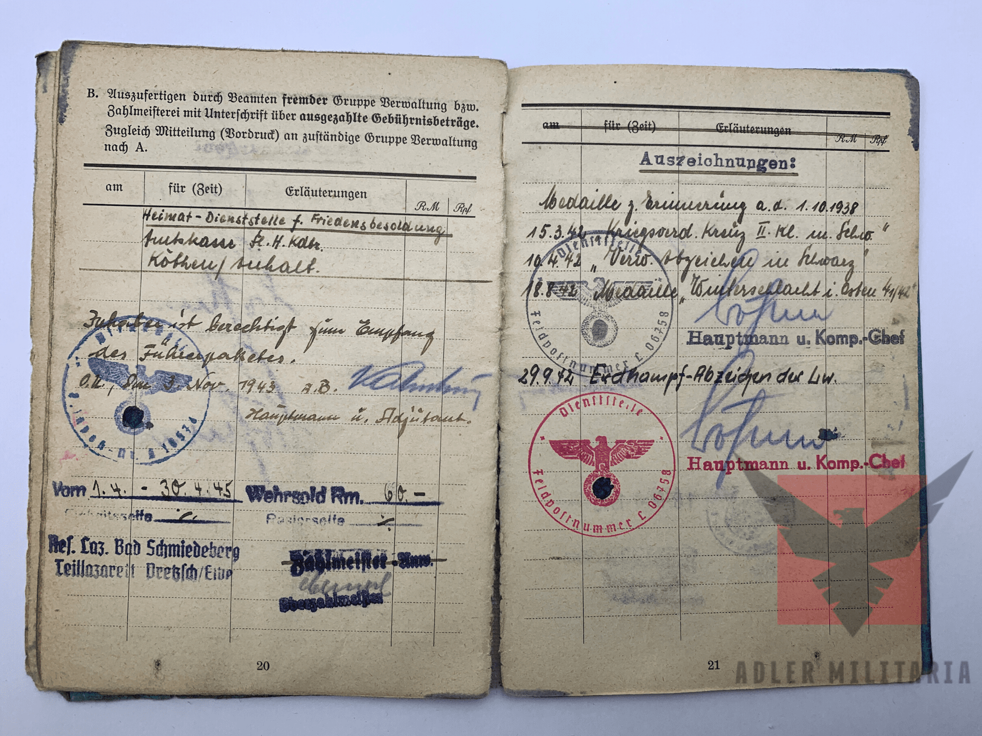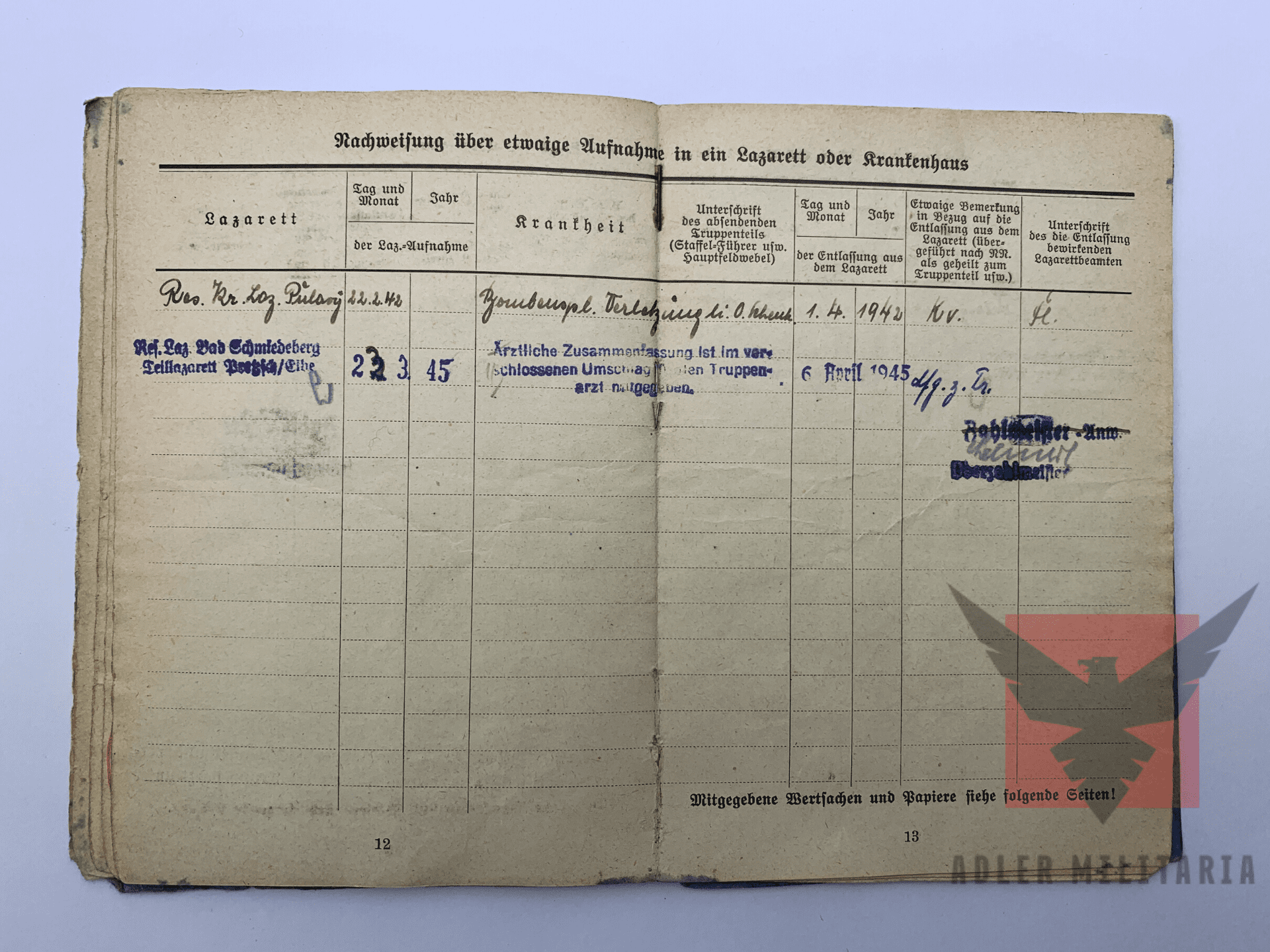 Injuries or Wounds: Kreutzer arrived on the 22nd of February 1942 in Hospital due to a bomb splinter hitting his left upper leg. Returned to his unit around two months later.