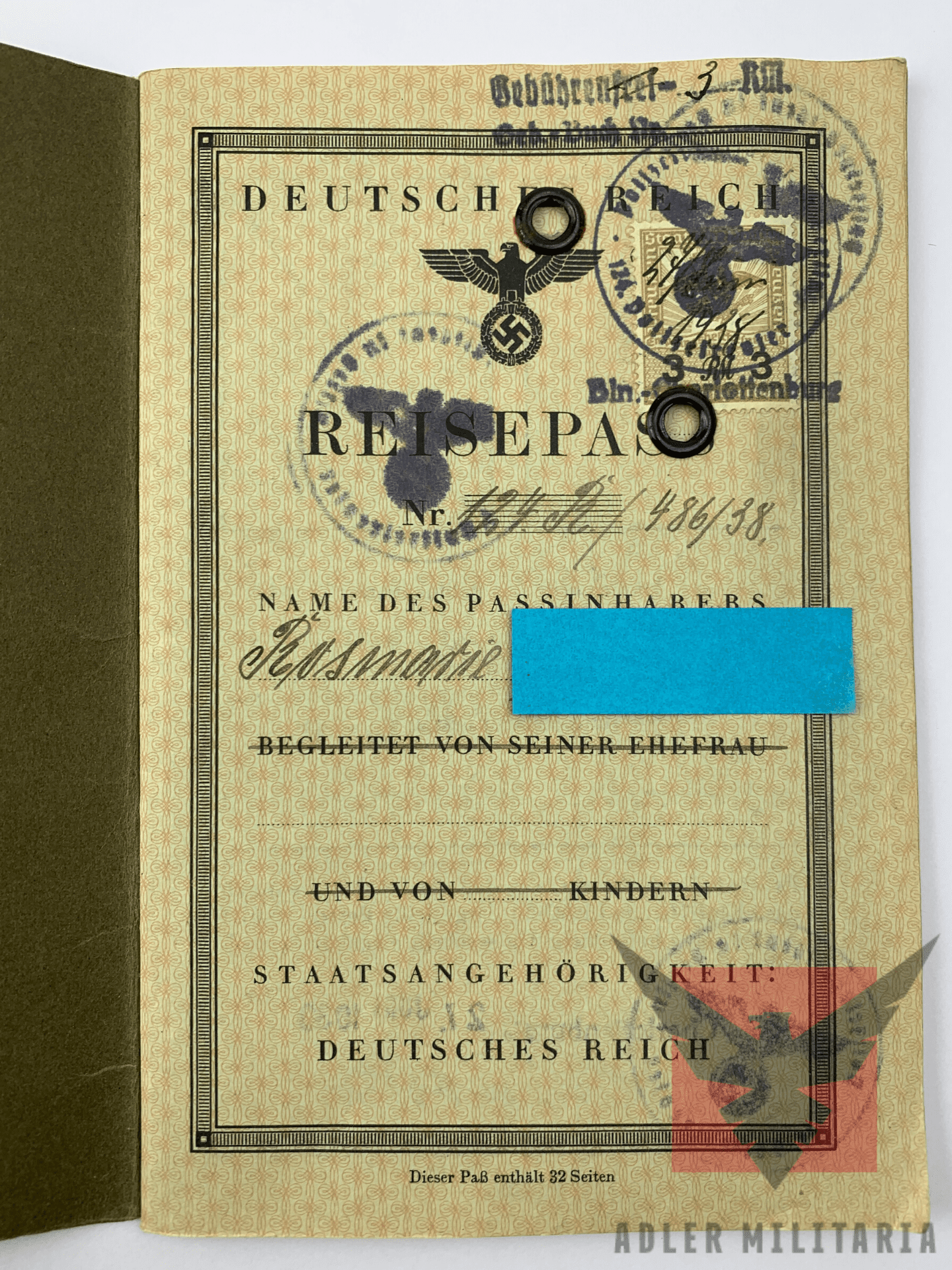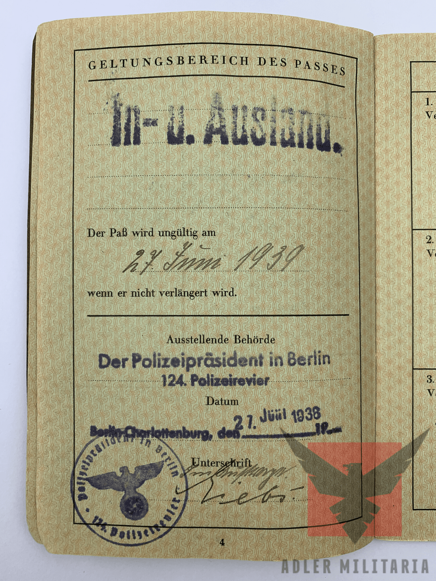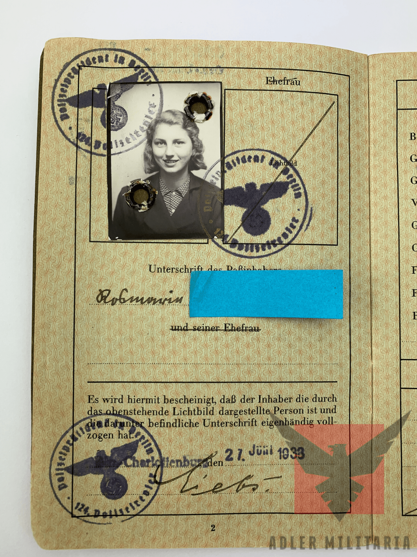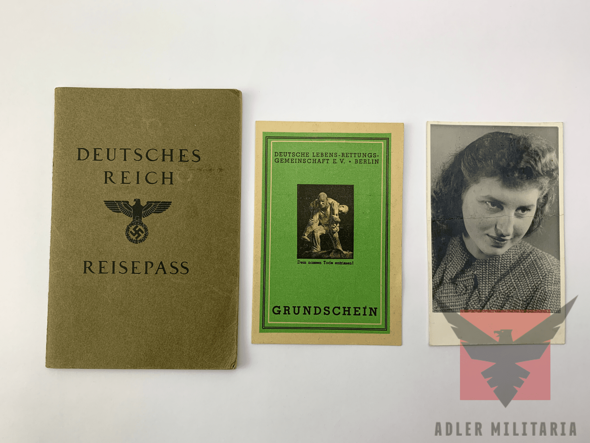 1. Third Reich Passport ‘Reisepass’ – Berliner Student Rosmarie K resident in Berlin Charlottenburg. Issued by the Police of Berlin. 124. Polizeirevier on the 27th of June 1933. Period Attached Photograph. One Entry: To Helsinki in 1938.