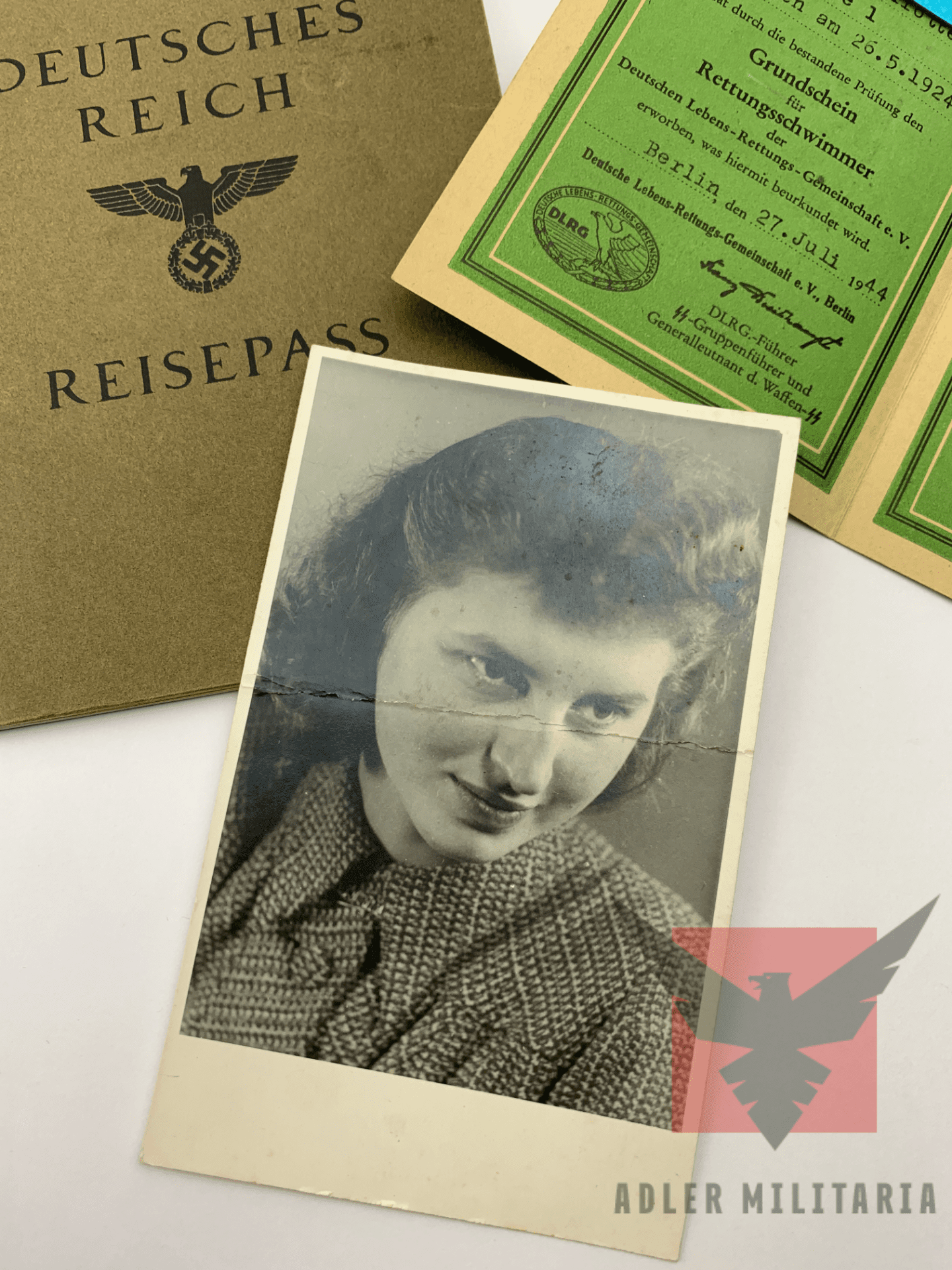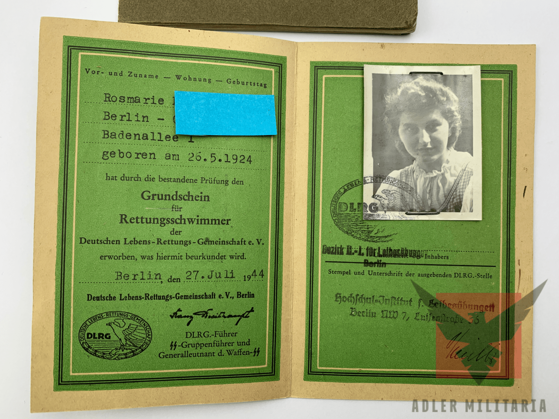 2. DLRG Life Saver Swimmer Pass – On the rear of the card in German is the test that must be passed. Original Period Applied Photo. Issued by the Hochschule Inst für Leibesübungen, Berlin on the 27th of July 1944. Under the direction of: DLRG-Führer Franz Breithaupt SS -Obergruppenführer und Generalleutnant d. Waffen SS. (Breithaupt was Commander for some time of the SS Court Main Office and was shot by his SS Aide Karl Lang on the 29th of April 1945).