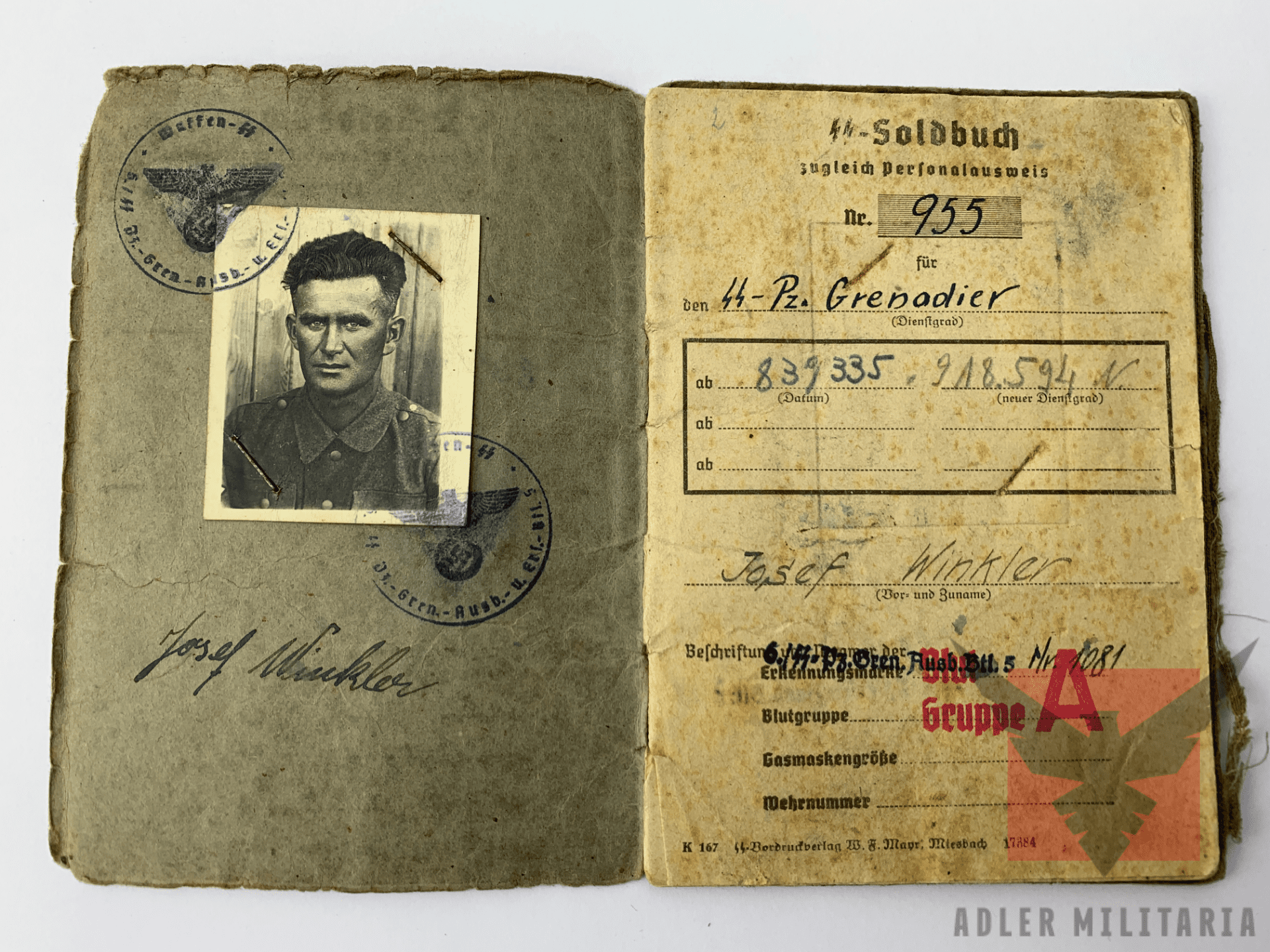 By September 1944, Winkler was issued a full set of uniform and kit in Ellwangen. His SS Soldbuch was security checked in September by an SS Untersturmführer, now with a picture attached of Winkler, just before he was given his SS insignia, a clear picture of the late war SS Uniform can be seen, according to the rear of another photo this was taken in Ellwangen.