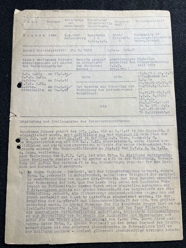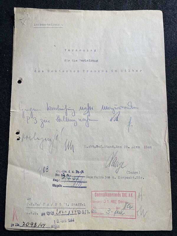 WW2 German Wehrmacht General Wolfgang Lange – German Cross in Silver – Vorschlag – Hauptmann Otto Krause – Korps Abteilung C – Rare