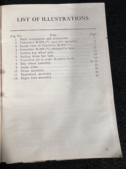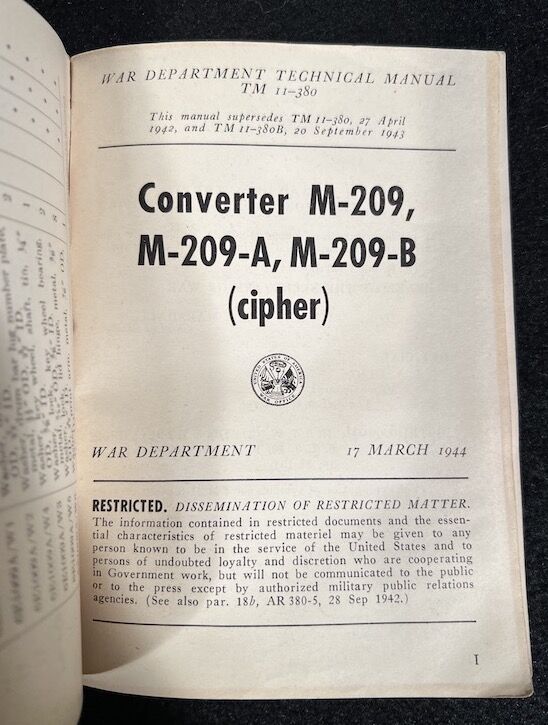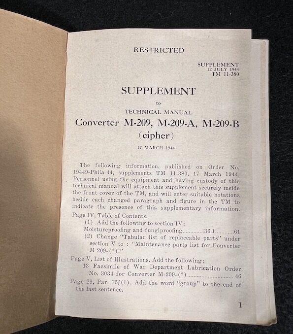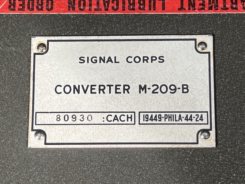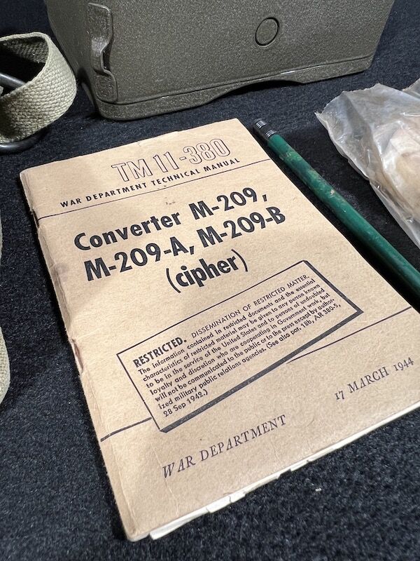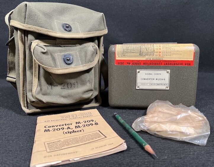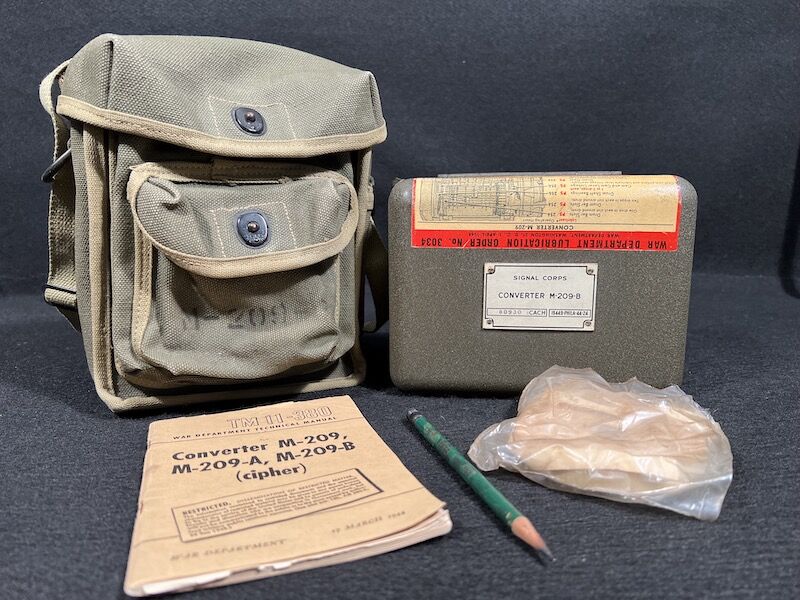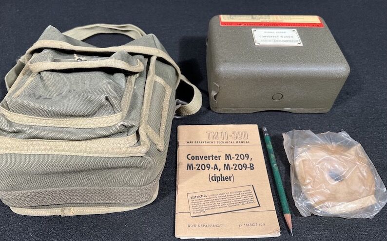Encoding Machine, screwdriver, paper tape, technical manual, webbing bag and pencil. The Converter M-209-B was a small, compact, hand-operated, tape printing, cryptographic mechanical device. It used a series of rotors to encipher and decipher radio transmitted tactical messages rapidly.