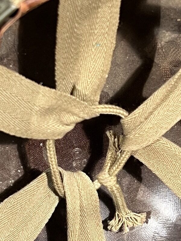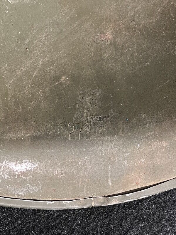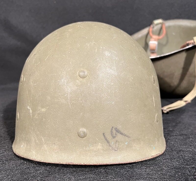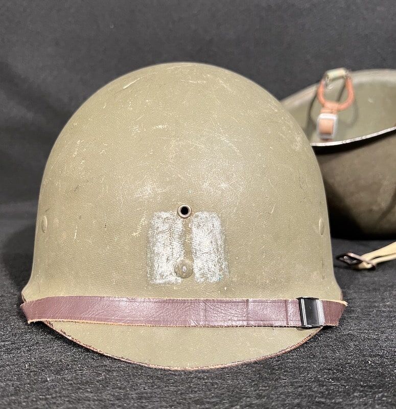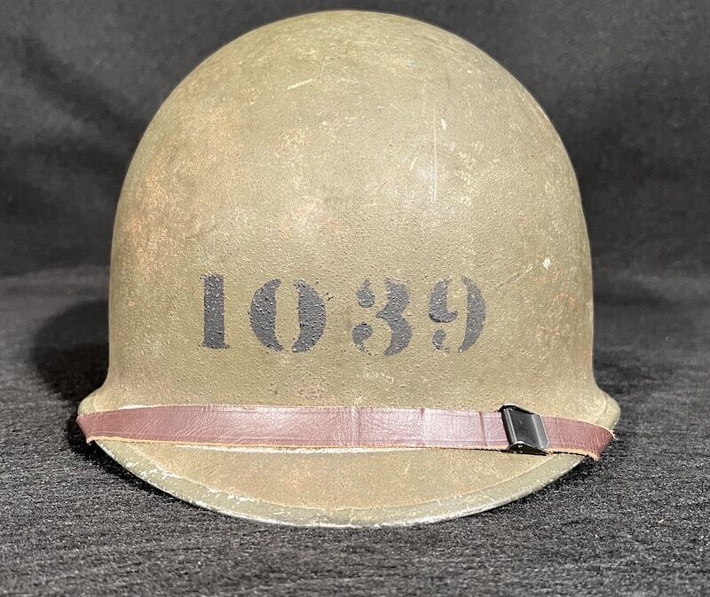 Wonderful original WWII U.S.N. LST-1039 M1 helmet set – The McCord Radiator and Manufacturing Company produced front seam fixed bale helmet shell has a heat stamp of 272C, dating its production to October 1942 being the third lift of steel blanks from the Carnegie Steel Company in that production run.