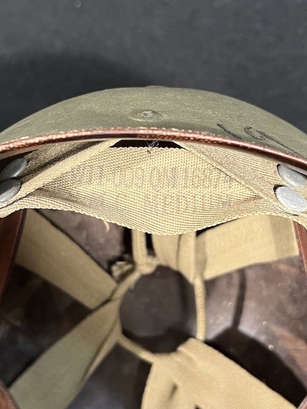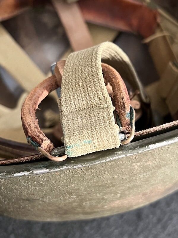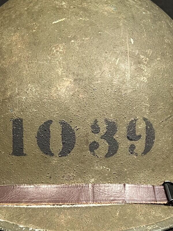 In addition to the original hand painted “1039” marking, the helmet retains its original olive drab factory finish, cork texture, and OD#3 (khaki) chinstraps. The Westinghouse liner features non-painted steel A-washers, d15 Production Code, dating the liner’s production to mid-1942. The liner’s exterior exhibits evidence of Navy Lieutenant officers’ rank. The liner comes complete with an original size 7 rayon headband and a buckled leather liner strap.