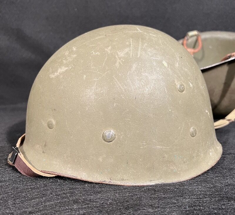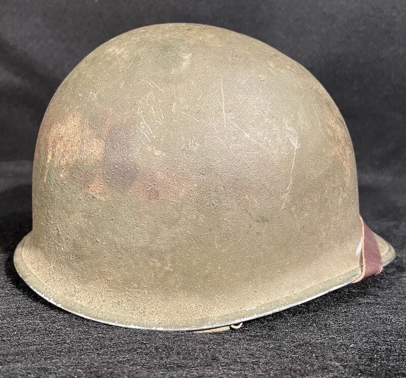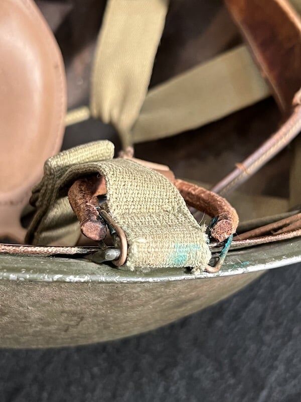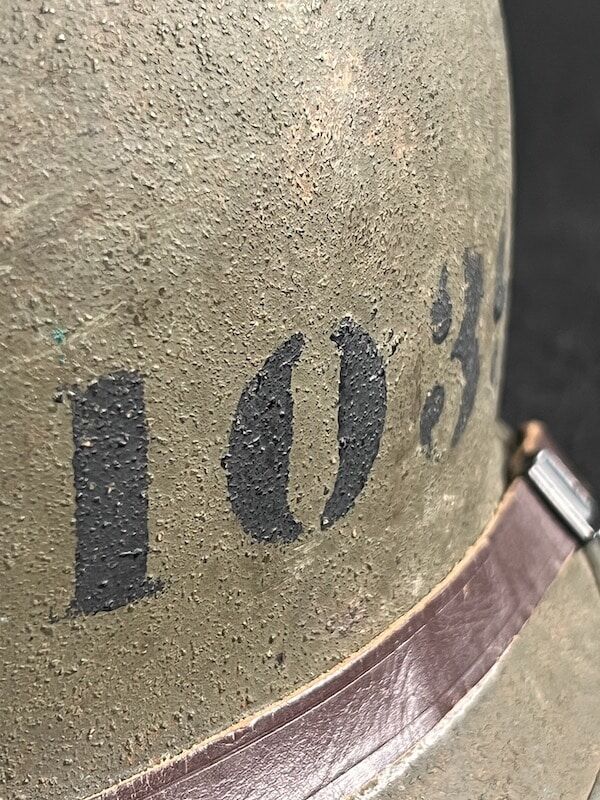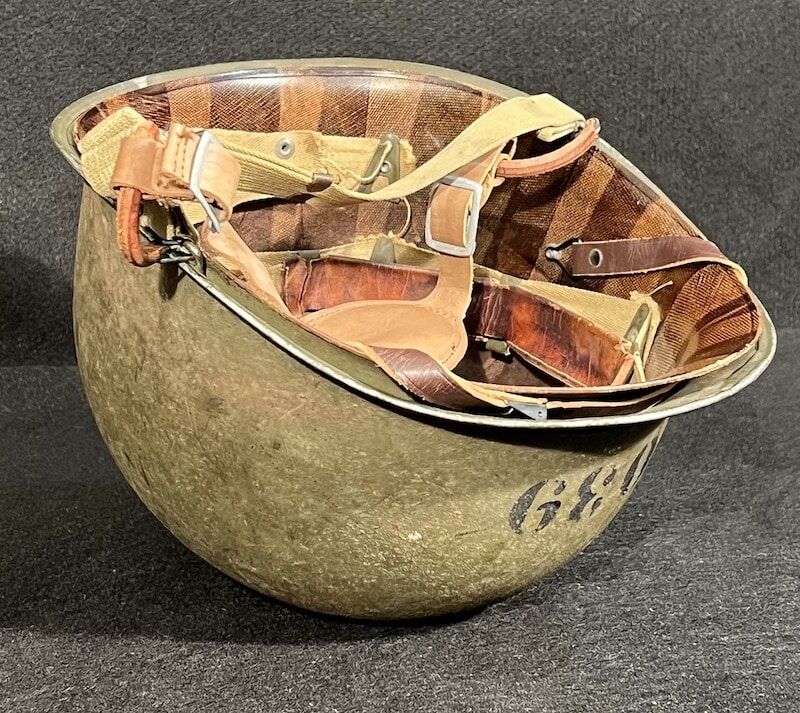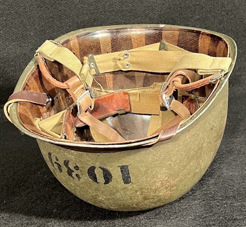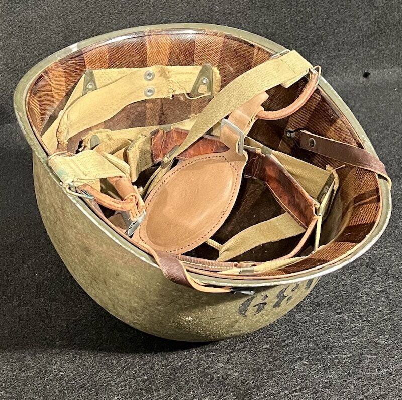 In addition to the OD#3 chinstrap this piece has been modified with a Navy Mk II Talker Helmet chinstrap which is sometimes seen on amphibious vessel operations. This exceptional find boasts the faint aroma of salt air when the liner is removed, a unique and unmistakable scent associated with all older naval vessels. A fine addition to any WW2 advanced helmet collection – recent estate acquisition and presented as acquired.