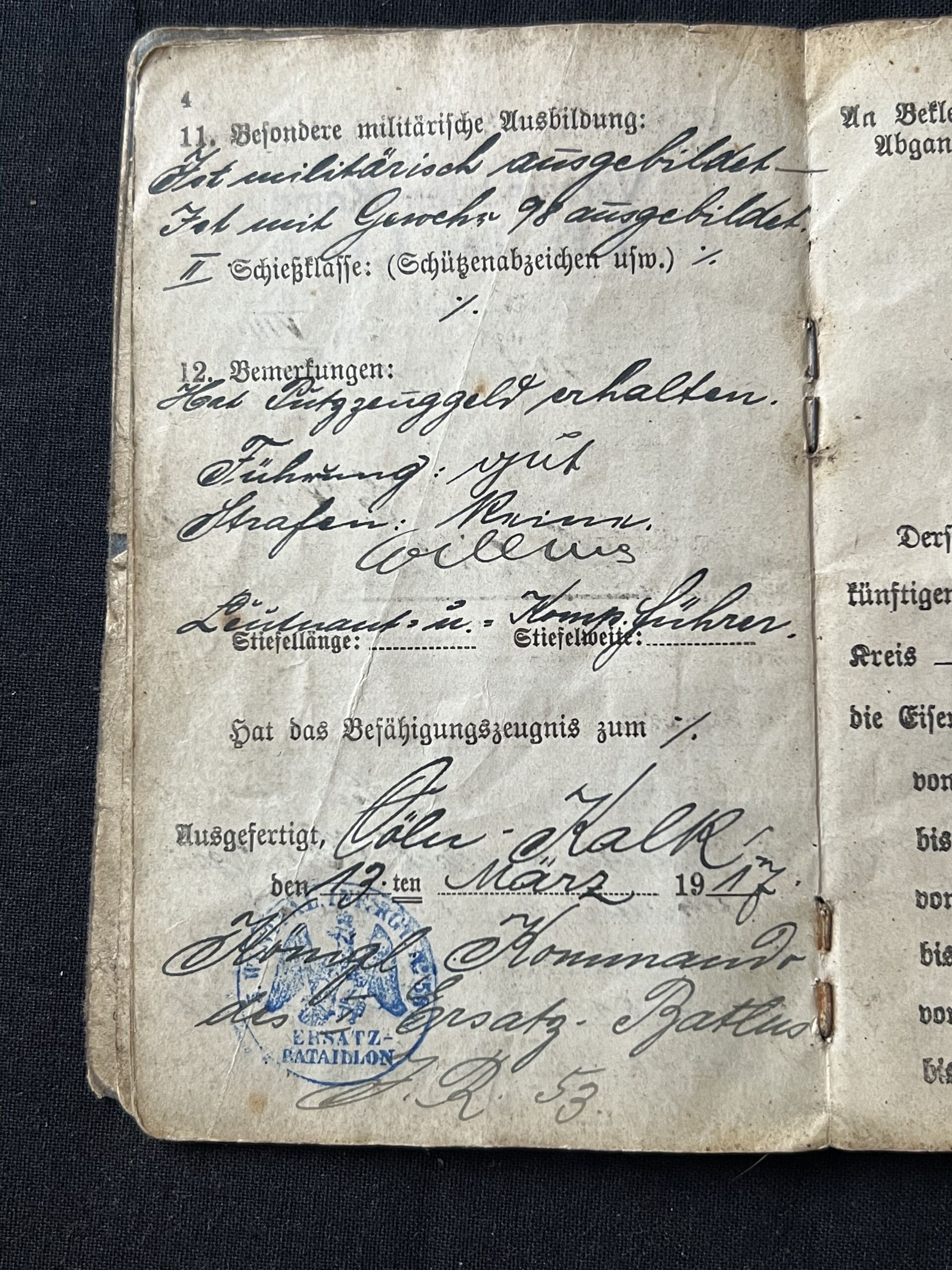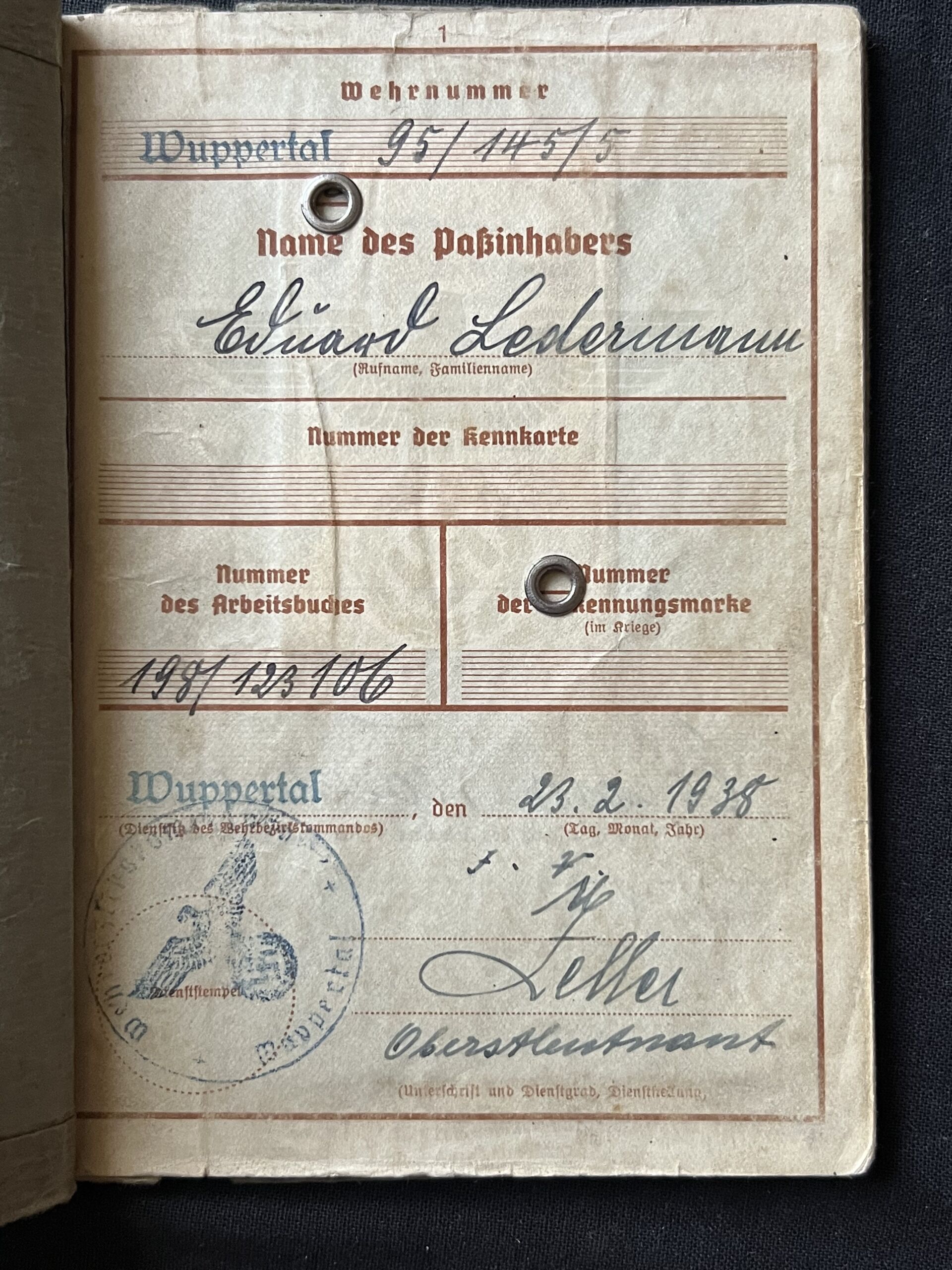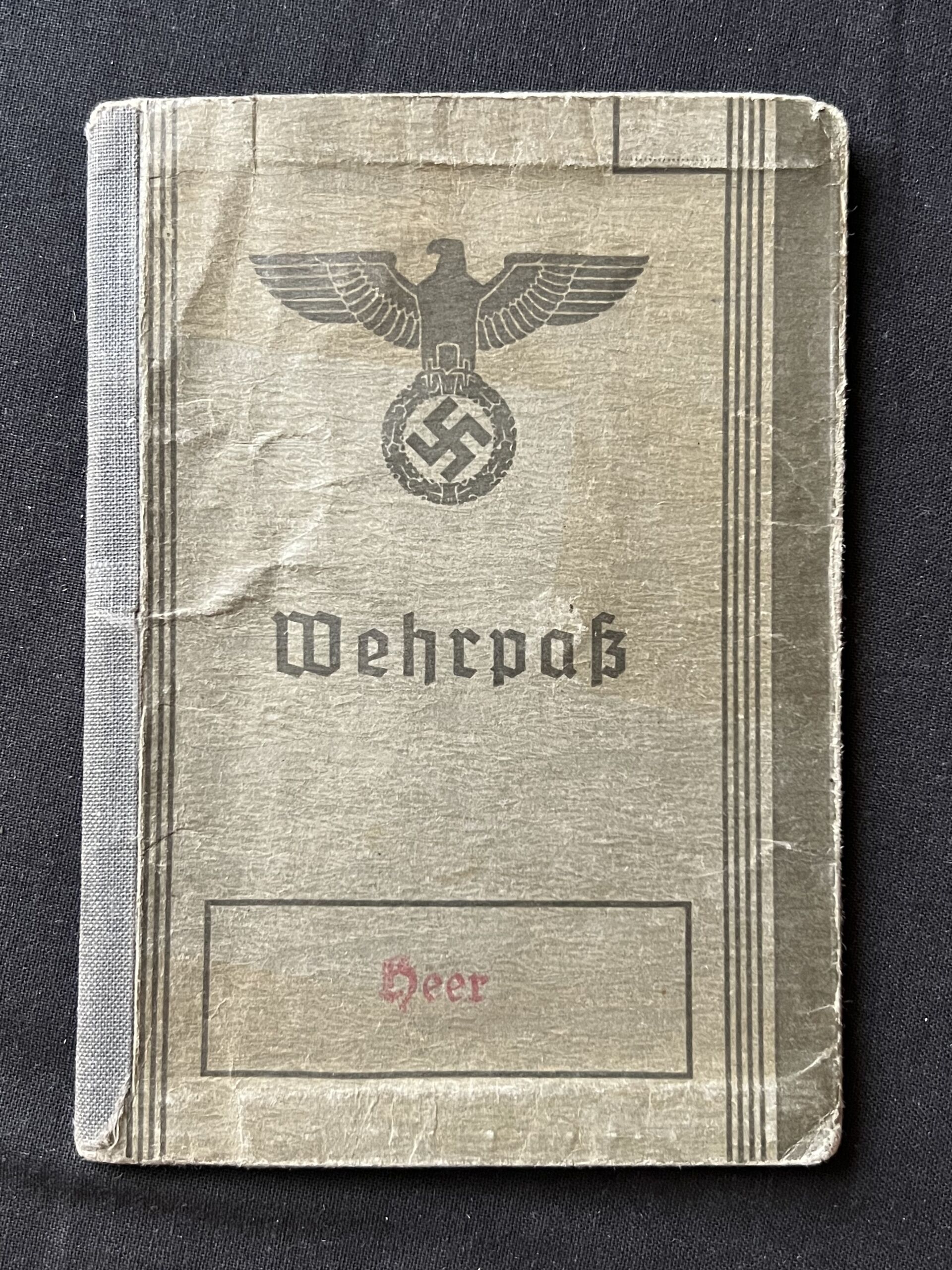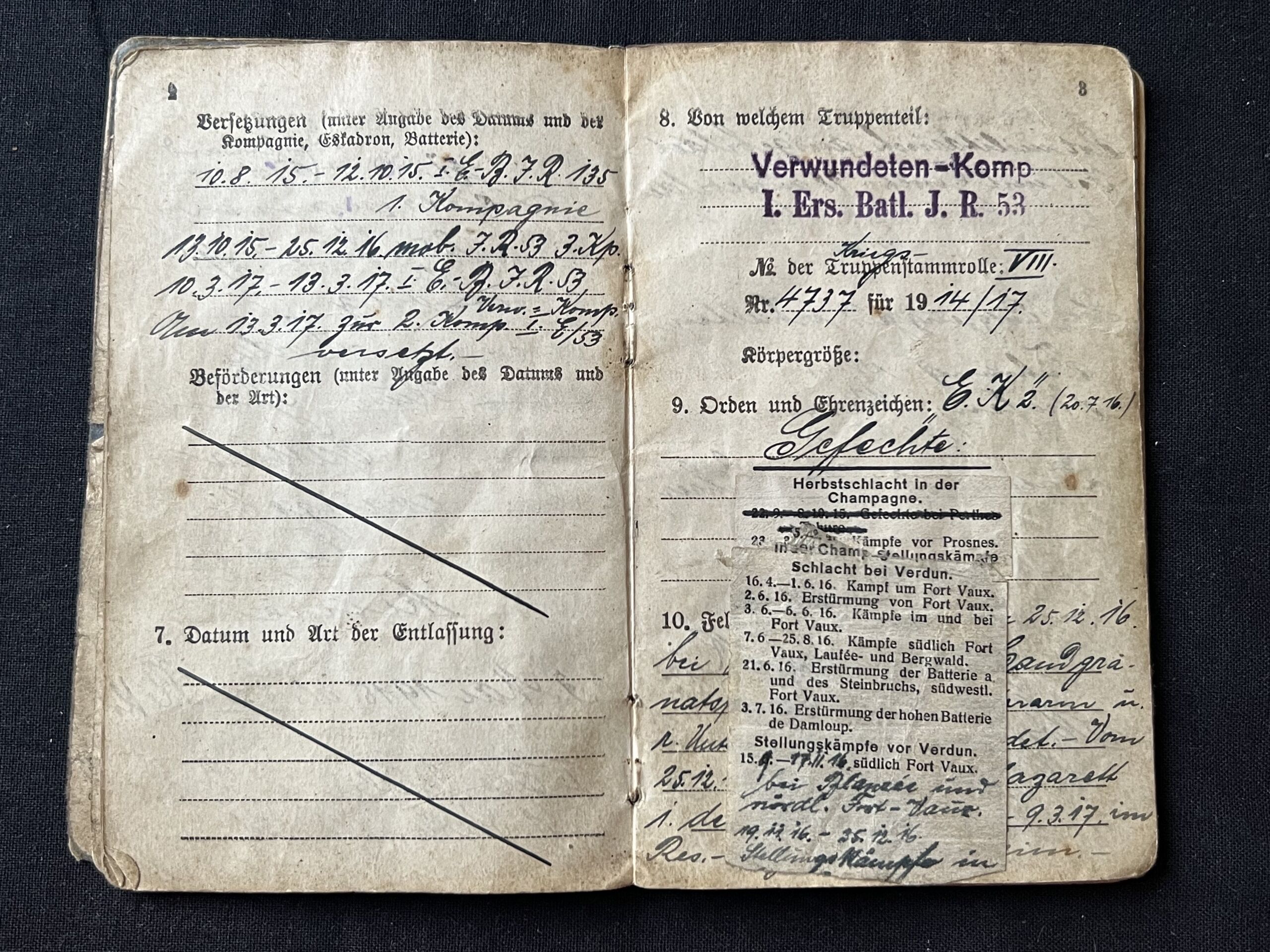 WWI German Soldbuch / Wehrpass WWII – Photos – Uffz Ledermann – 15 Landwehr Division – Fort Vaux – Crimea Ukraine – Iron Cross – Wounds Badge (Sold)