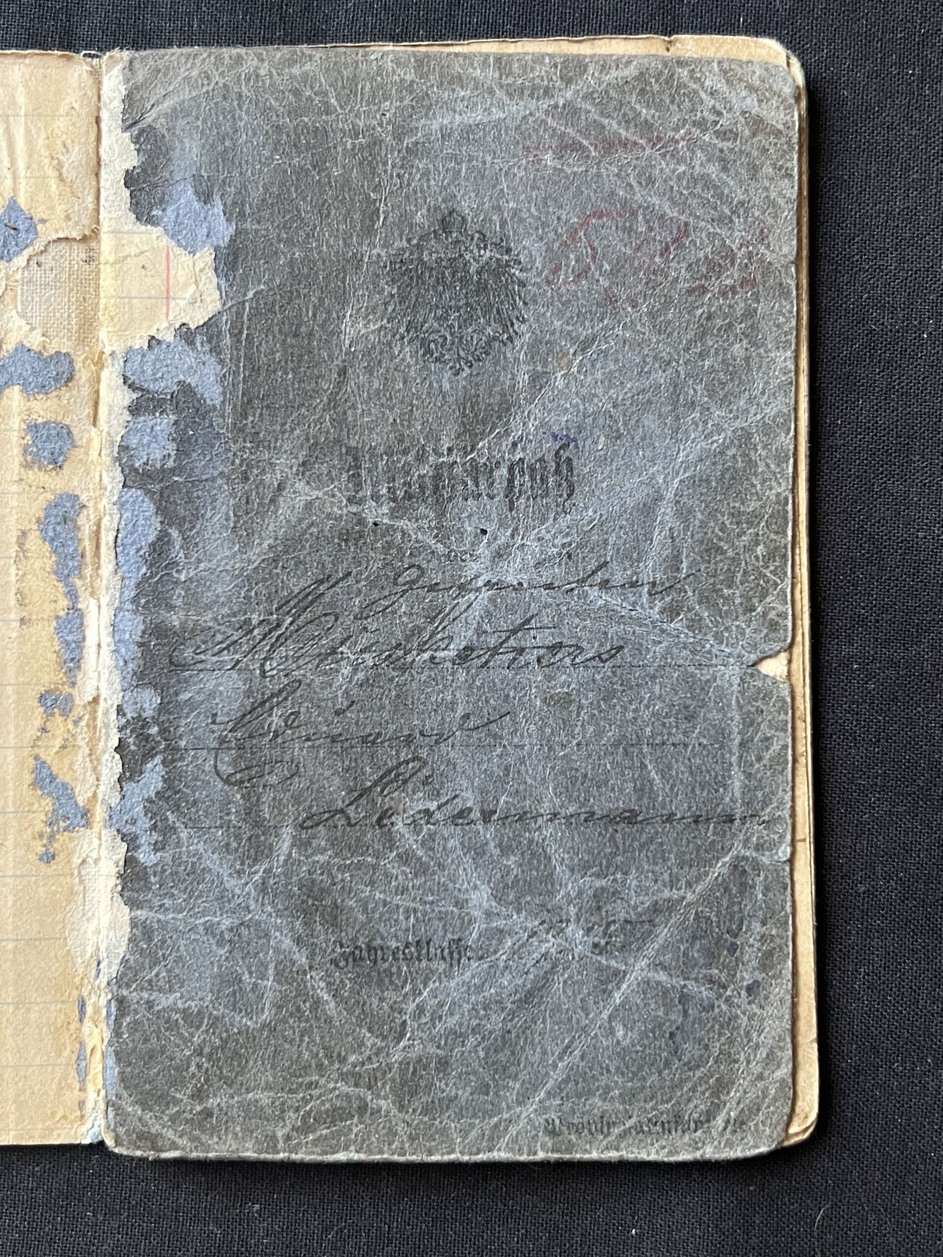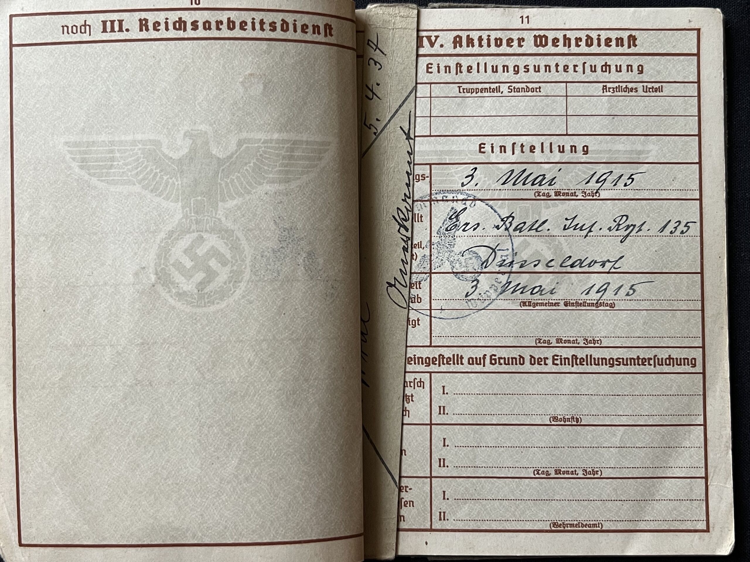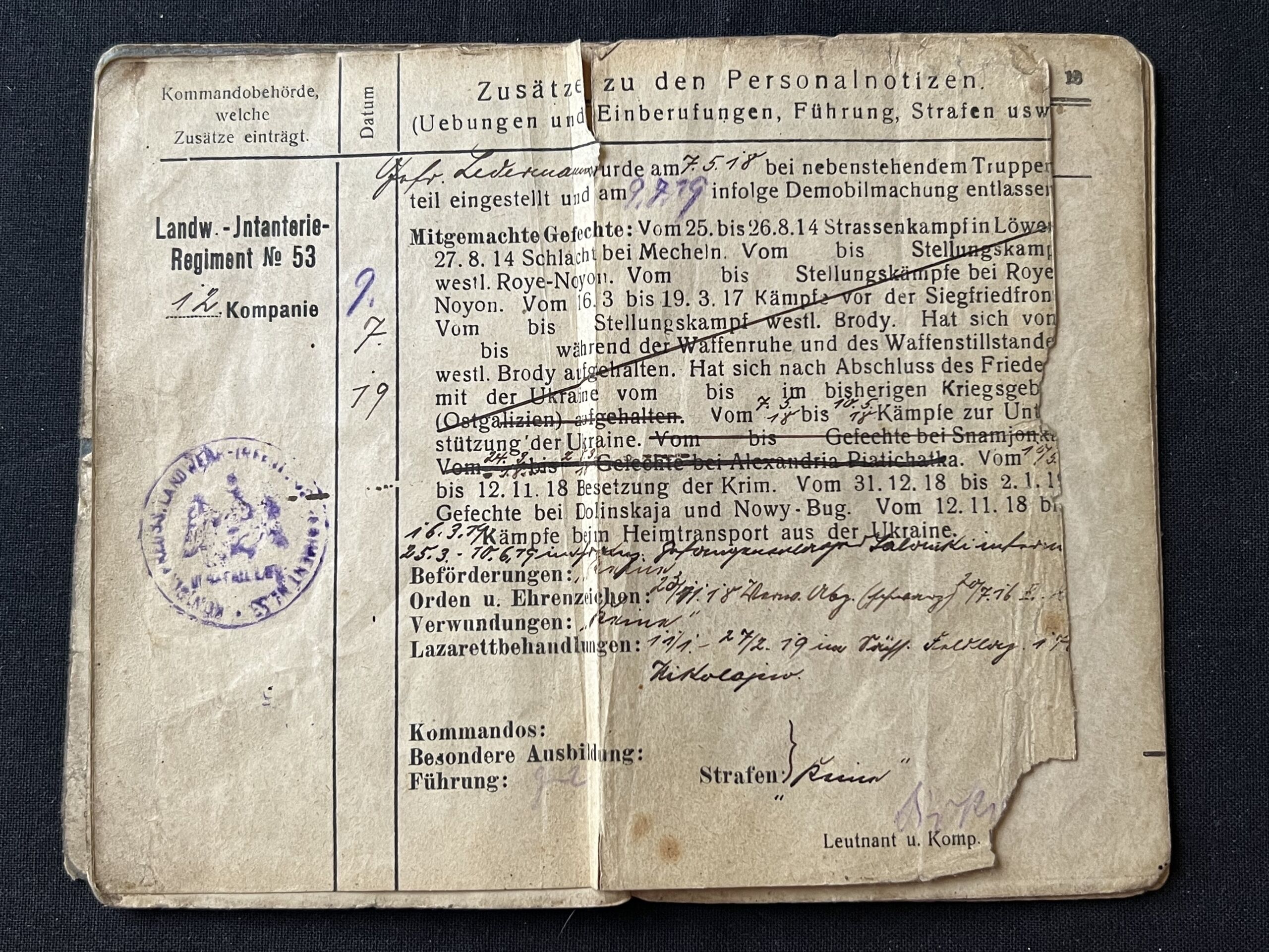 WWI German Soldbuch / Wehrpass WWII – Photos – Uffz Ledermann – 15 Landwehr Division – Fort Vaux – Crimea Ukraine – Iron Cross – Wounds Badge (Sold)