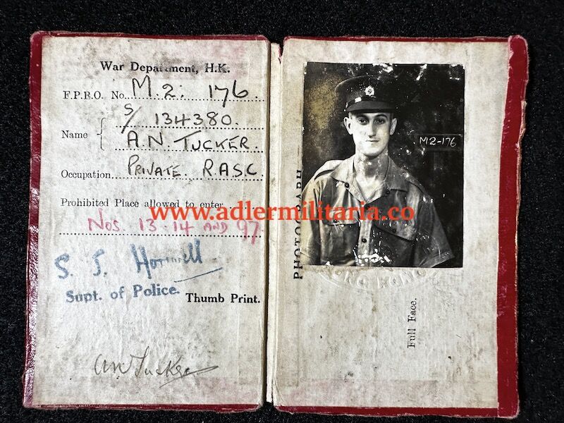 War Department Hong Kong Issued British Army ID Booklet – Issued to 134380 – A.N Tucker – Private – R.A.S.C – Ultra Rare Photographic British Army ID. Stamped and numbers matching