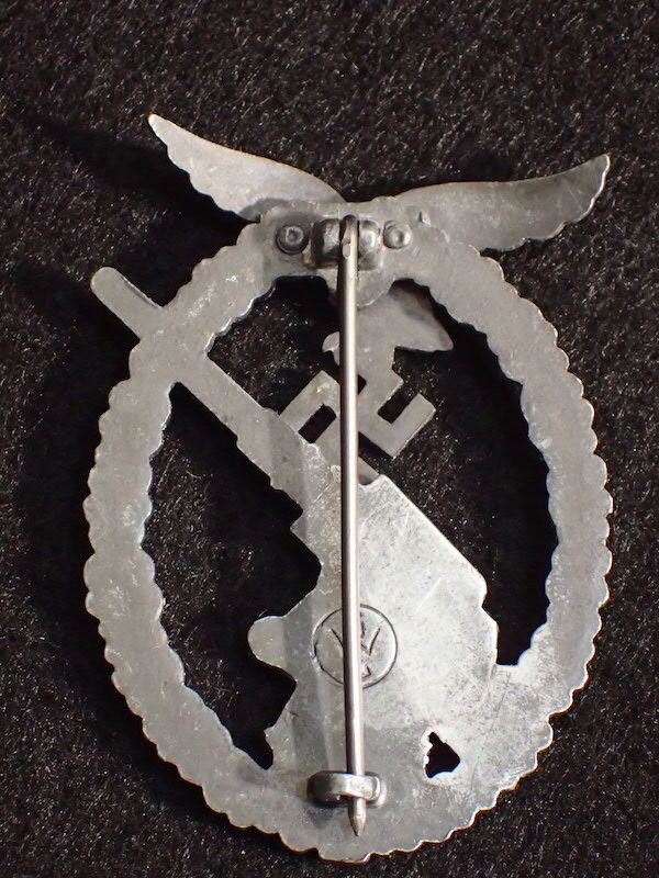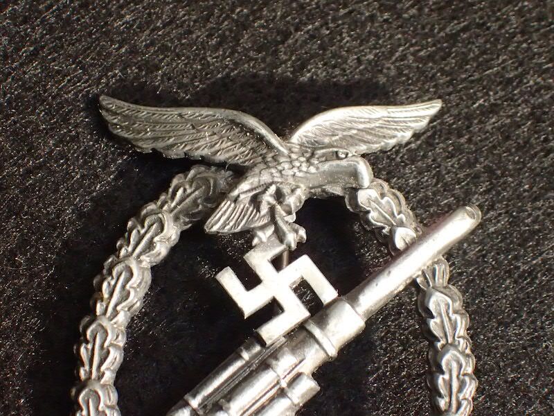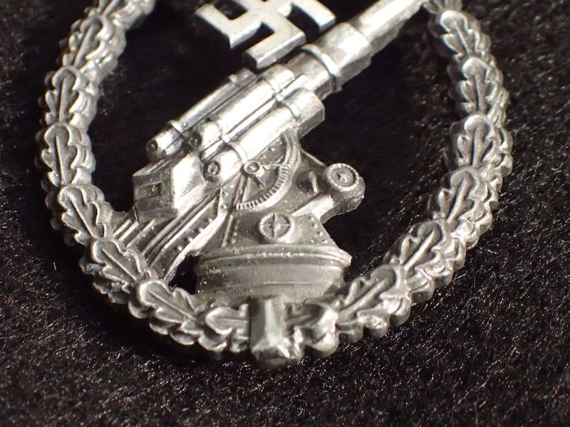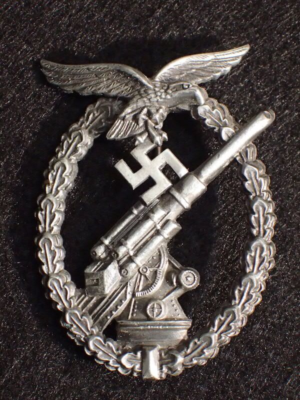 It was awarded after the accumulation of 16 points or could also be awarded outside of the points system for an act of merit or bravery in the performance of air defense duties. If the candidates’ battery brought down an enemy aircraft then the crew members were awarded four points. If two batteries were involved then each battery received two points.[2] Both officers and crews were eligible for the badge. The commanding officer for an anti-aircraft unit was eligible for the badge once half of his men also qualified for the badge. The award was also available to searchlight crews and sound-locator crews. Searchlight and sound-locator crews which assisted in the action by detection of aircraft could be awarded one point each. The German Army had a similar badge, however, earning points towards it were only awarded for the downing of aircraft and not for ground targets. Prior to the introduction of the Ground Assault Badge of the Luftwaffe, this badge could be awarded to a serviceman for the participation in three separate combat operations against tanks, bunkers or ships.