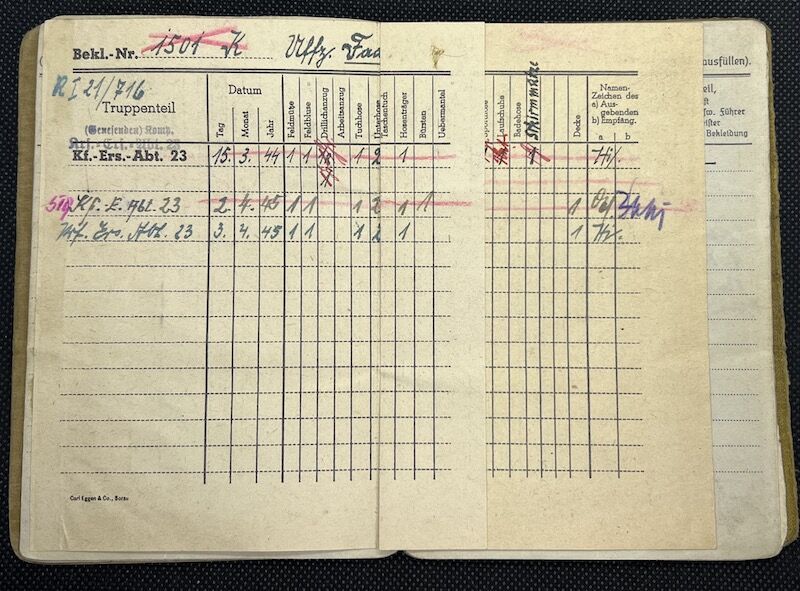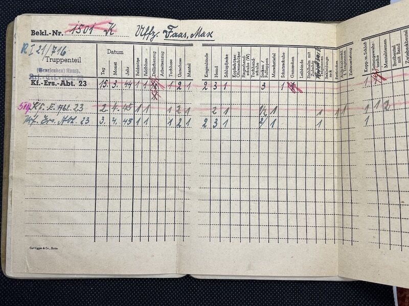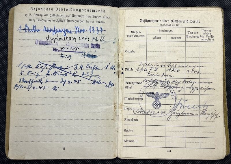 Faas was issued a full list of equipment, including iron rations in Rathenow on the 21st of April 1945. Armed with a FN Pistol (Personal Pistol).