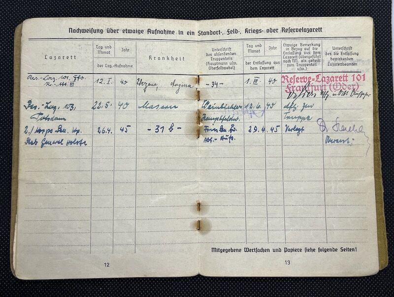 On the 26th of April 1945, Faas arrives at the Korps San Komp, Stab General Holste with a 31b – meaning grenade fragments from artillery, mortar or hand grenade.