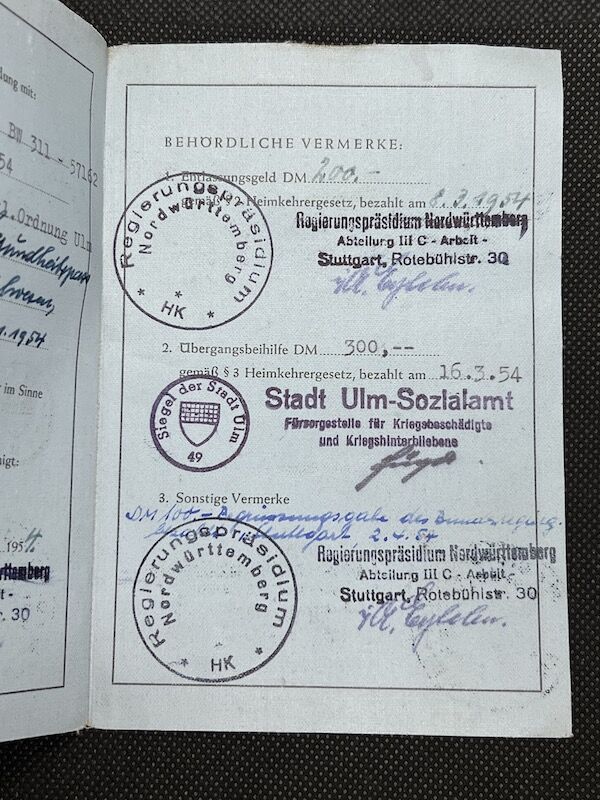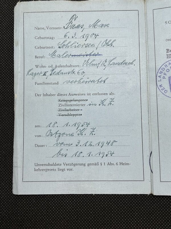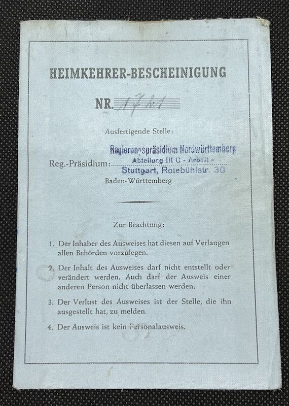 This is where it takes an unusual twist, according to his Heimkehrer Bescheinigung – A form of identification issued to people who have fled either from the Eastern Zone of Germany, or those suffering the aftermath including refugees of the war.