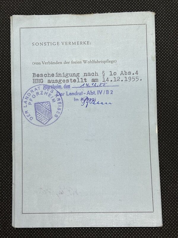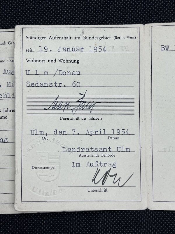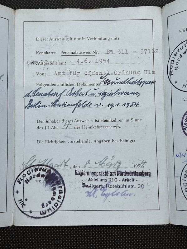 This ID was issued in Berlin Marienfelde in 1954 – it clearly states he was a Prisoner of the Ostzone KZ – meaning German Eastern Zone Concentration camp – from 1948 till 1954. What his alleged crime was we will not be able to find out, maybe he tried to escape to go towards his family and was caught in December of 1948?