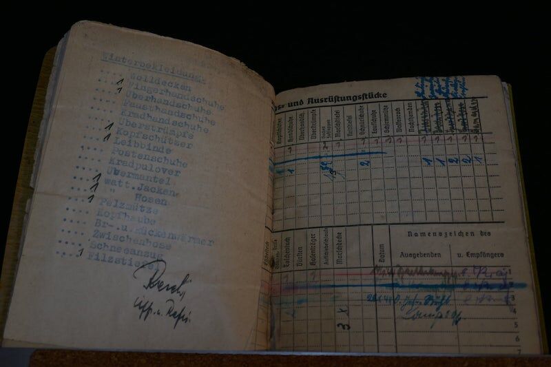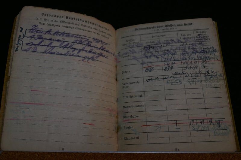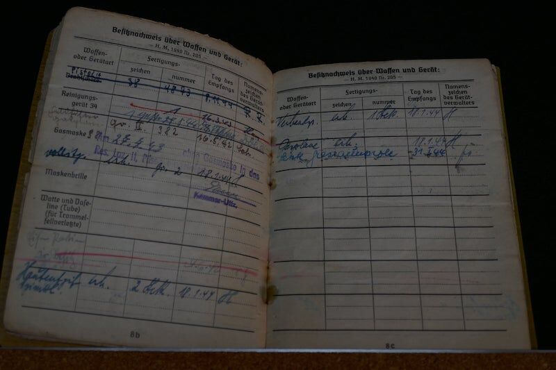 Soldbuch, with numerous entries, delivery of material, including a Luger P08 pistol and another Walther P38, a Kar98 bcd mauser, (manufacturer: Gustloff Werke), winter clothing, … ..