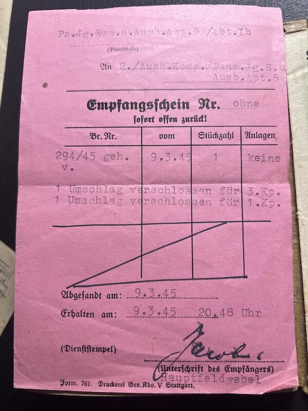 In March of 1945, he was assigned to 3 / schwere Heeres Panzerjäger-Abteilung 682 (mot).