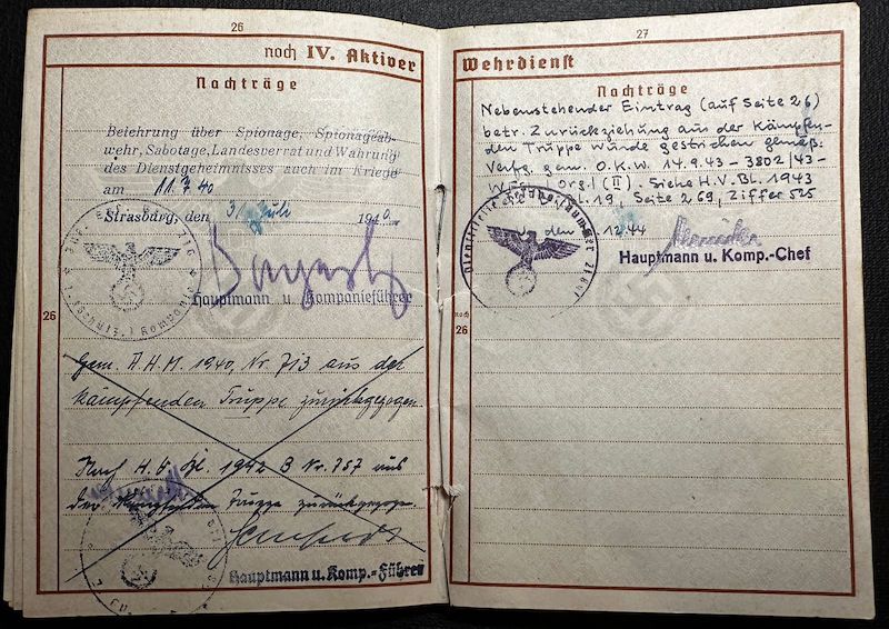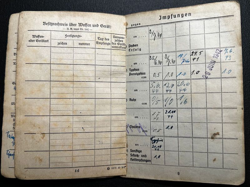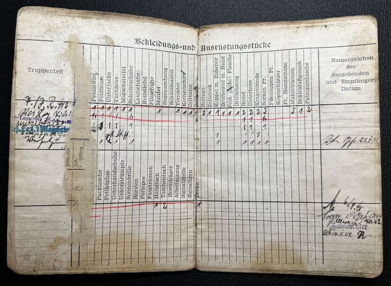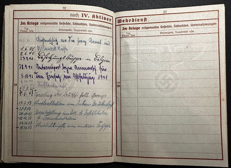 Wounded with the Infanterie Regiment 412 near Leningrad in April 1942. According to his Wehrpass (Page 32) He served on the French Channel Coast and the Atlantic Coast. For three months he was in Belgium as the Occupying Force. Arriving on the Russian front in October of 1941. After his wounding he was on the German Holland Border from August 1942 till June 1943. Then back to the Eastern front to the Kuban Bridgehead, and defensive battles in Ukraine.