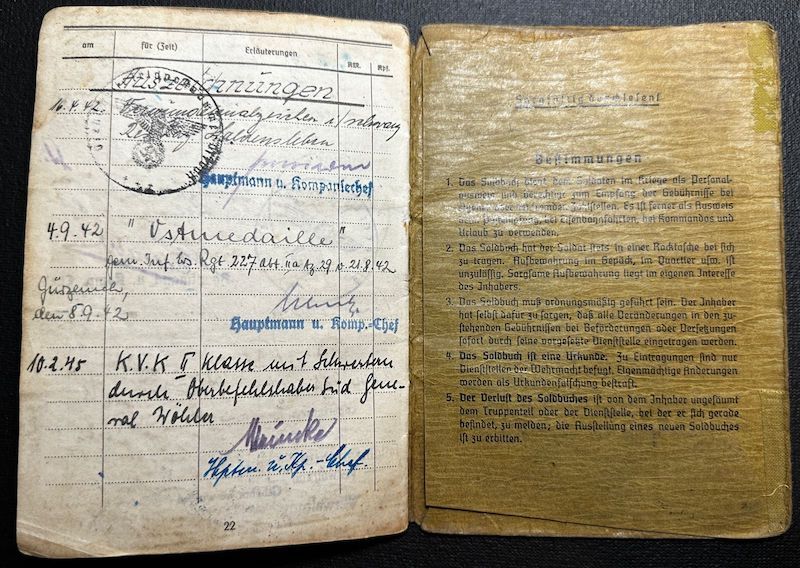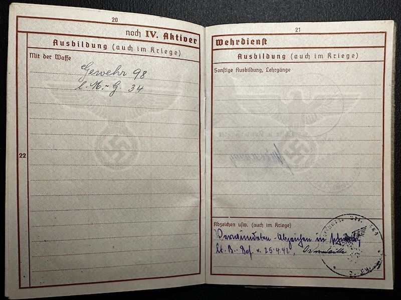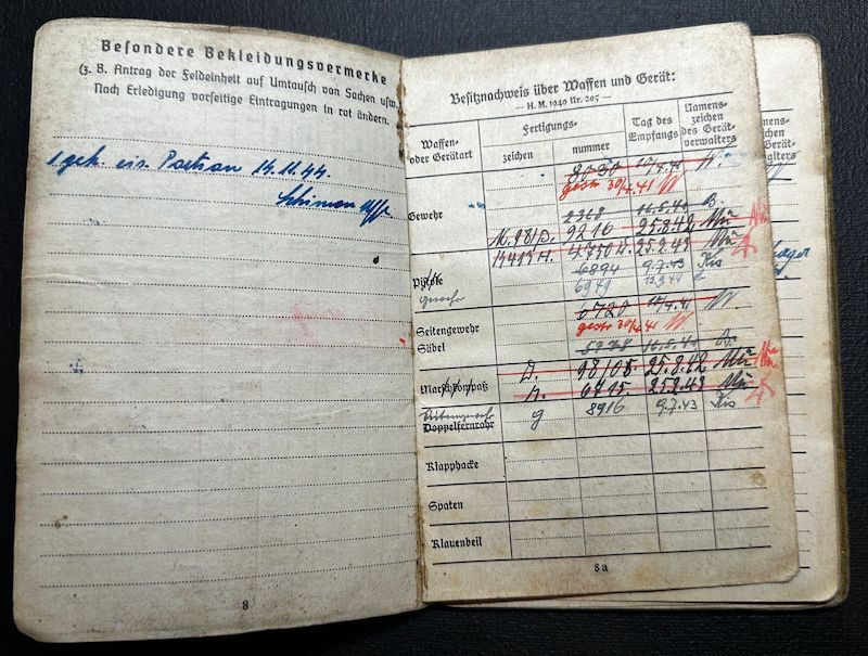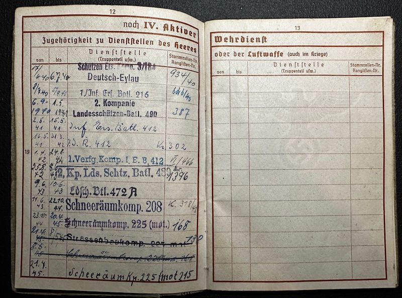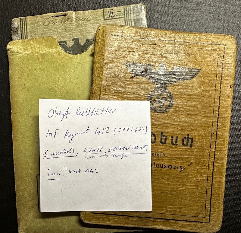WWII German Army Wehrmacht Soldbuch / Wehrpass – Obgef Rullkötter – Twin Brother KIA – Infanterie Regiment 412 – Wounded near Leningrad – Schneeraum 225