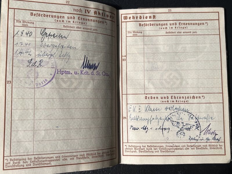 WWII German Army Wehrpass – Uffz Quick – Stab – 2rd Fallschirmjäger Division – France 1944 – Iron Cross – Ground Assault Badge Luftwaffe (Sold)