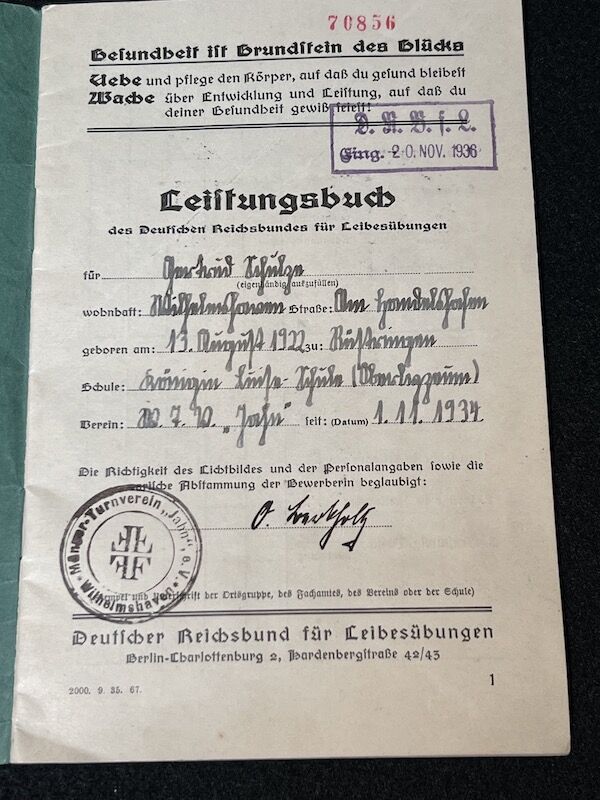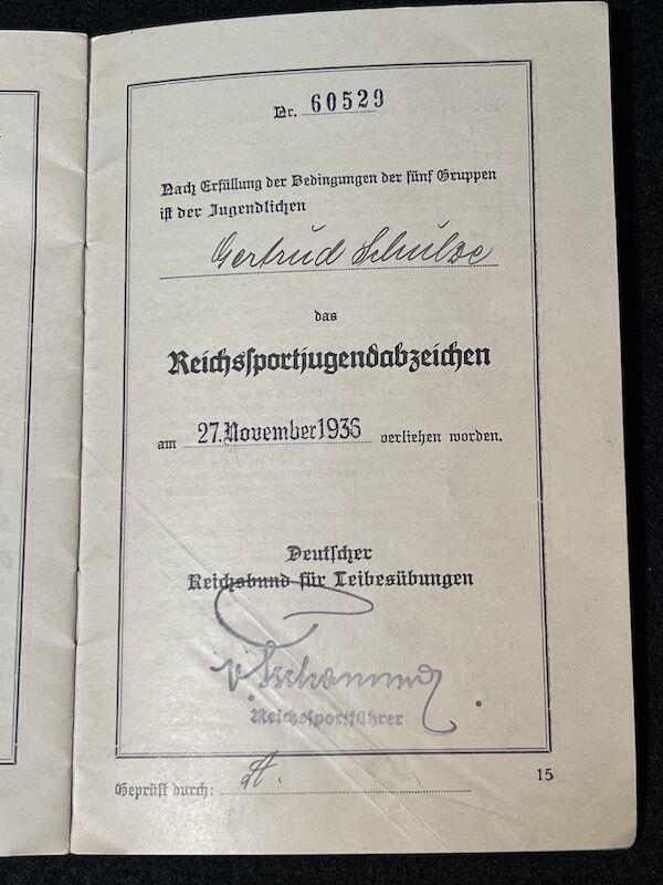 An ID issued to 14 year old for the award of the Reich Youth Sports Badge.