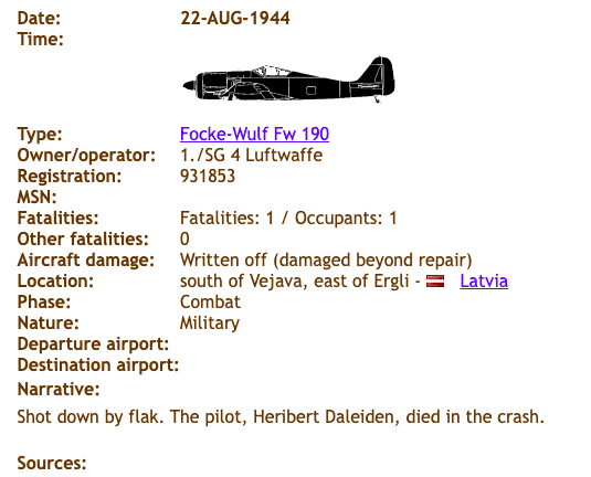 The pilot was serving with Schlachtgeschwader 4 operating out of Cesis, when the crash happened according to the German Archives (see attached) his body was recovered by the Wehrmacht and buried but his grave is not known exactly where.
