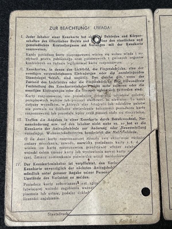 WWII German Identity Papers – Kennkarte – General Government Warsaw Poland – 1943 – Rare