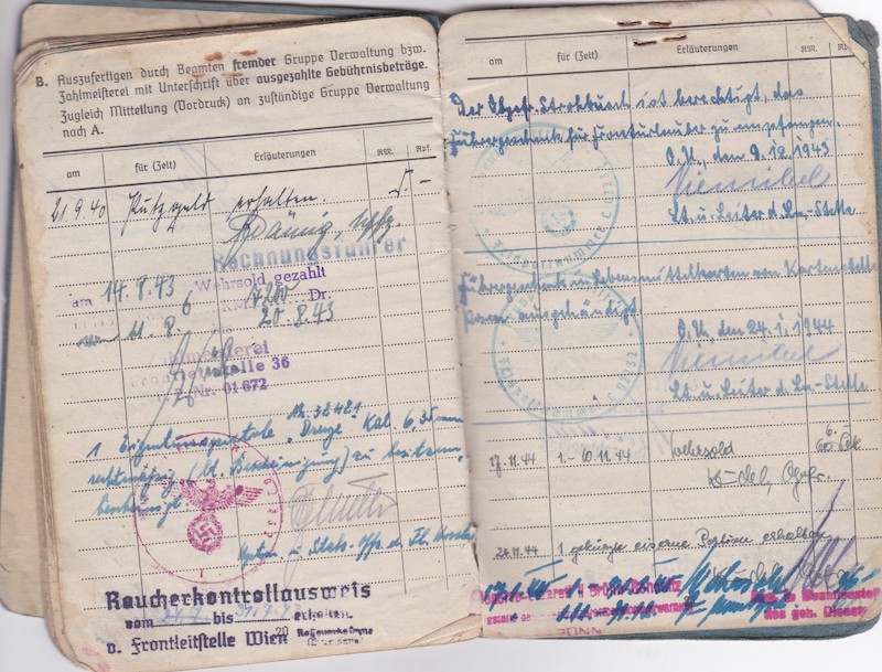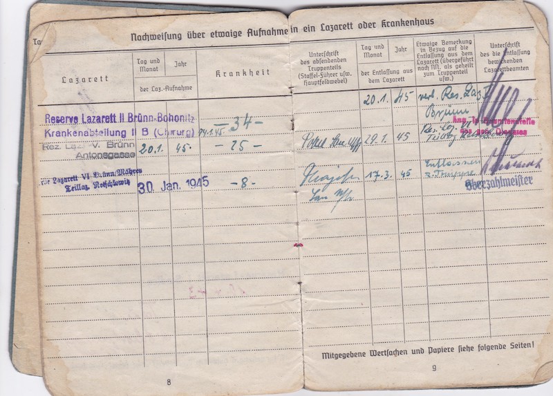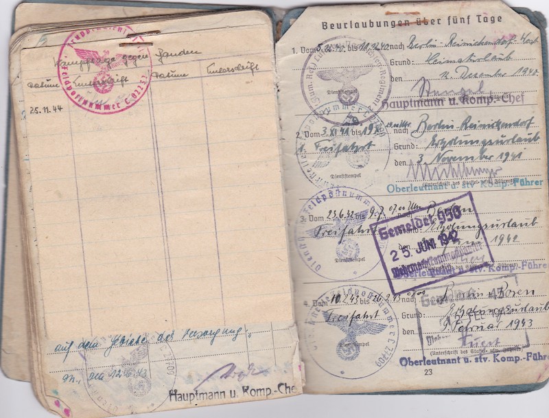 Entry Berlin April 1945 – Was warned about the forgering of paperwork in Berlin Kladow 9.April 1945! Also an entry on 10.4.1945 in Berlin Kladow was issued a first aid kit.Â
