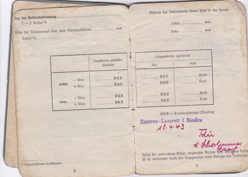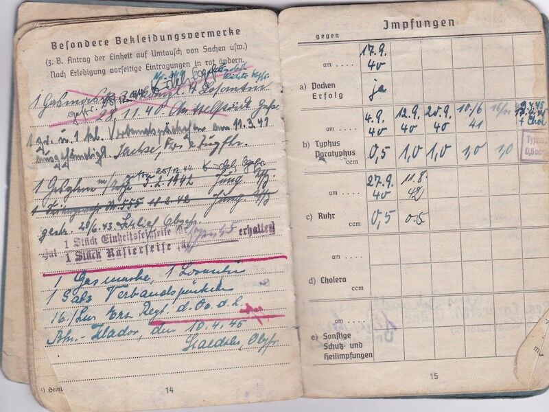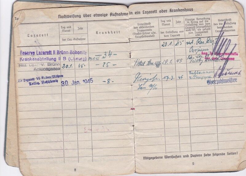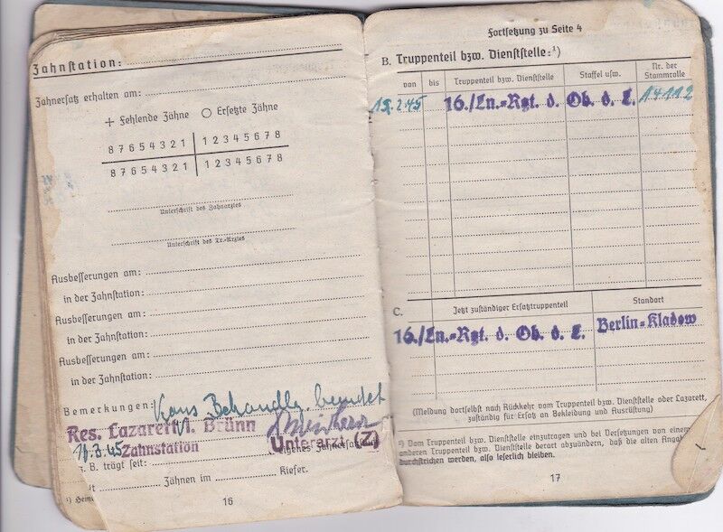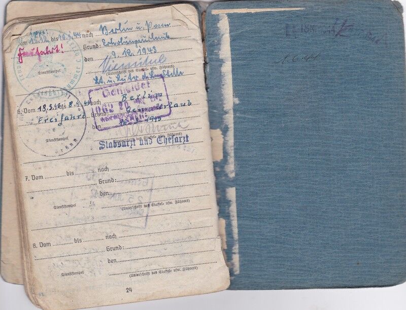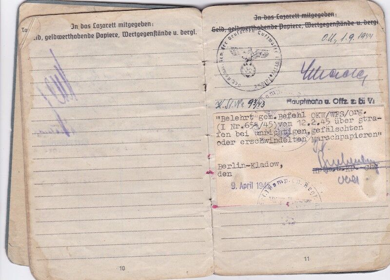 Entry Berlin April 1945 – Was warned about the forgering of paperwork in Berlin Kladow 9.April 1945! Also an entry on 10.4.1945 in Berlin Kladow was issued a first aid kit.